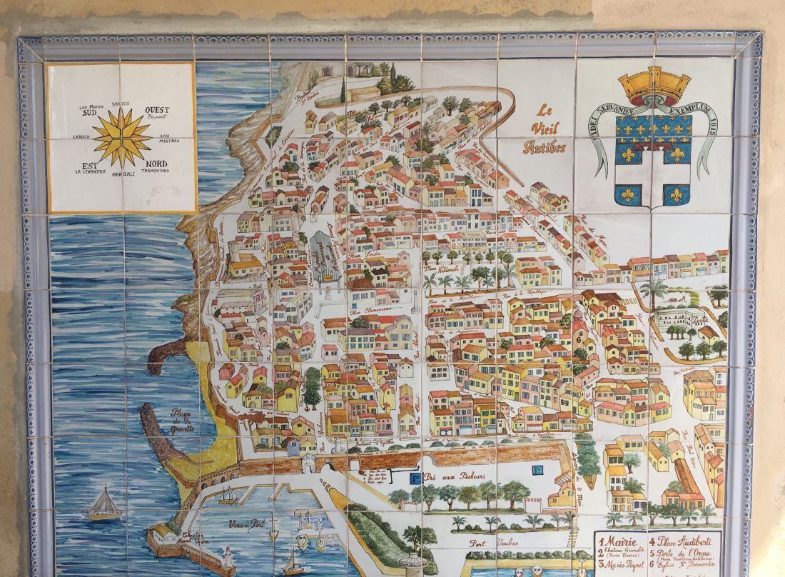 Tile map of the old town of Antibes in the arch at the end of Rue Thuret