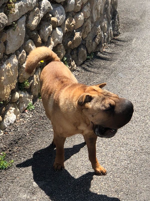 ![]() We met this friendly sharpei who was walking around town with his owner without a leash. He has a funny face but so friendly and anybody could touch him. |