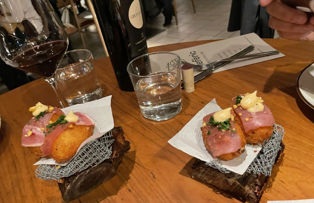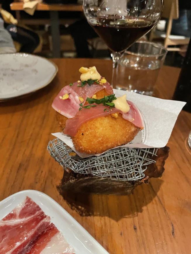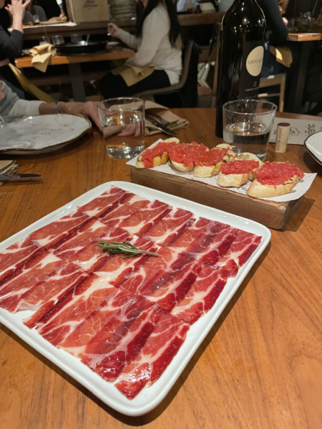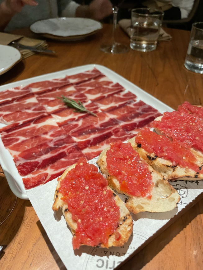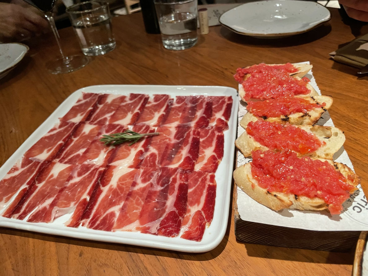 Jamon Iberico de Bellota, Iberian Pata Negra ham 38 months cured served with pan con tomato.