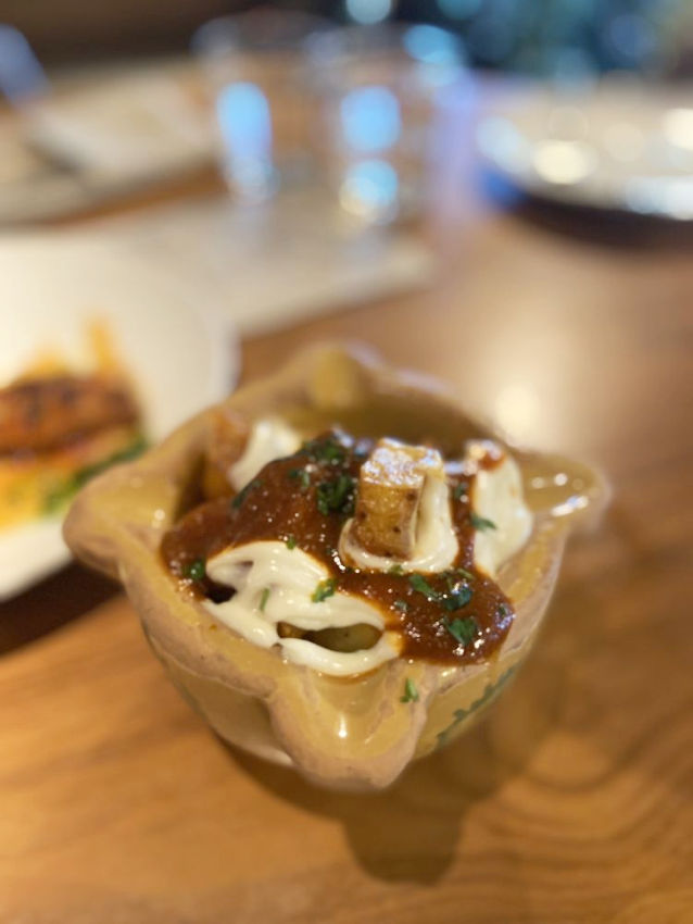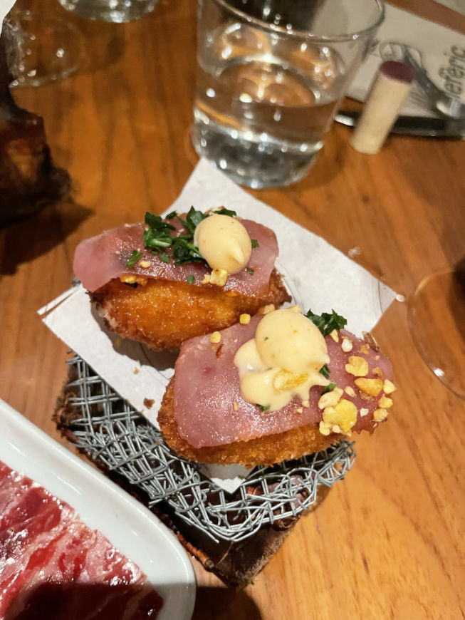 Crab croquettes with tuna sashimi on top and a doll up of spicy aioli.