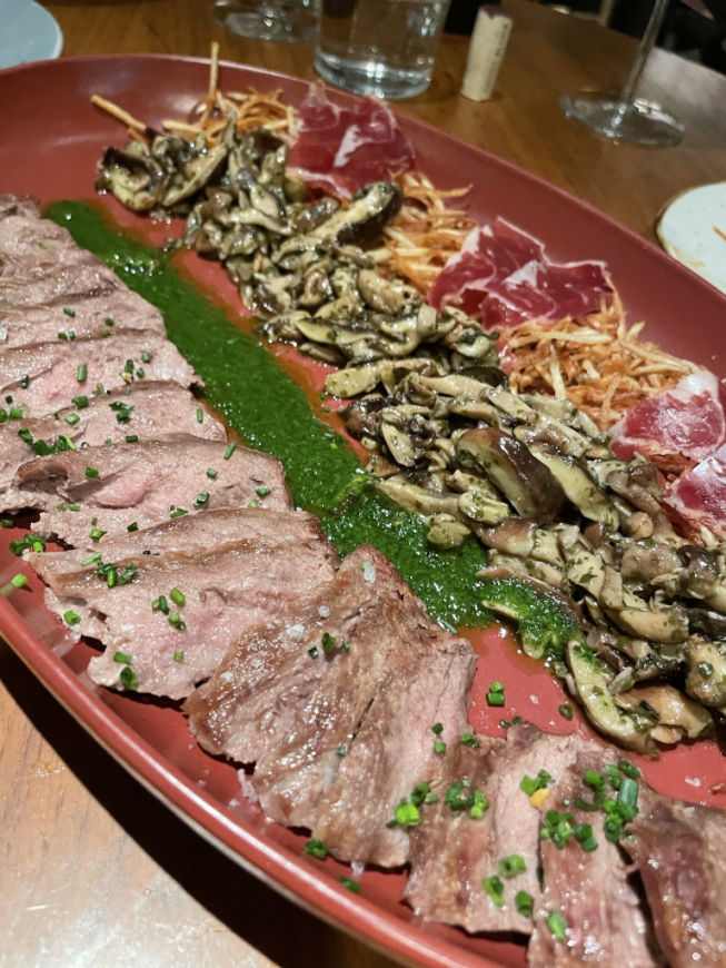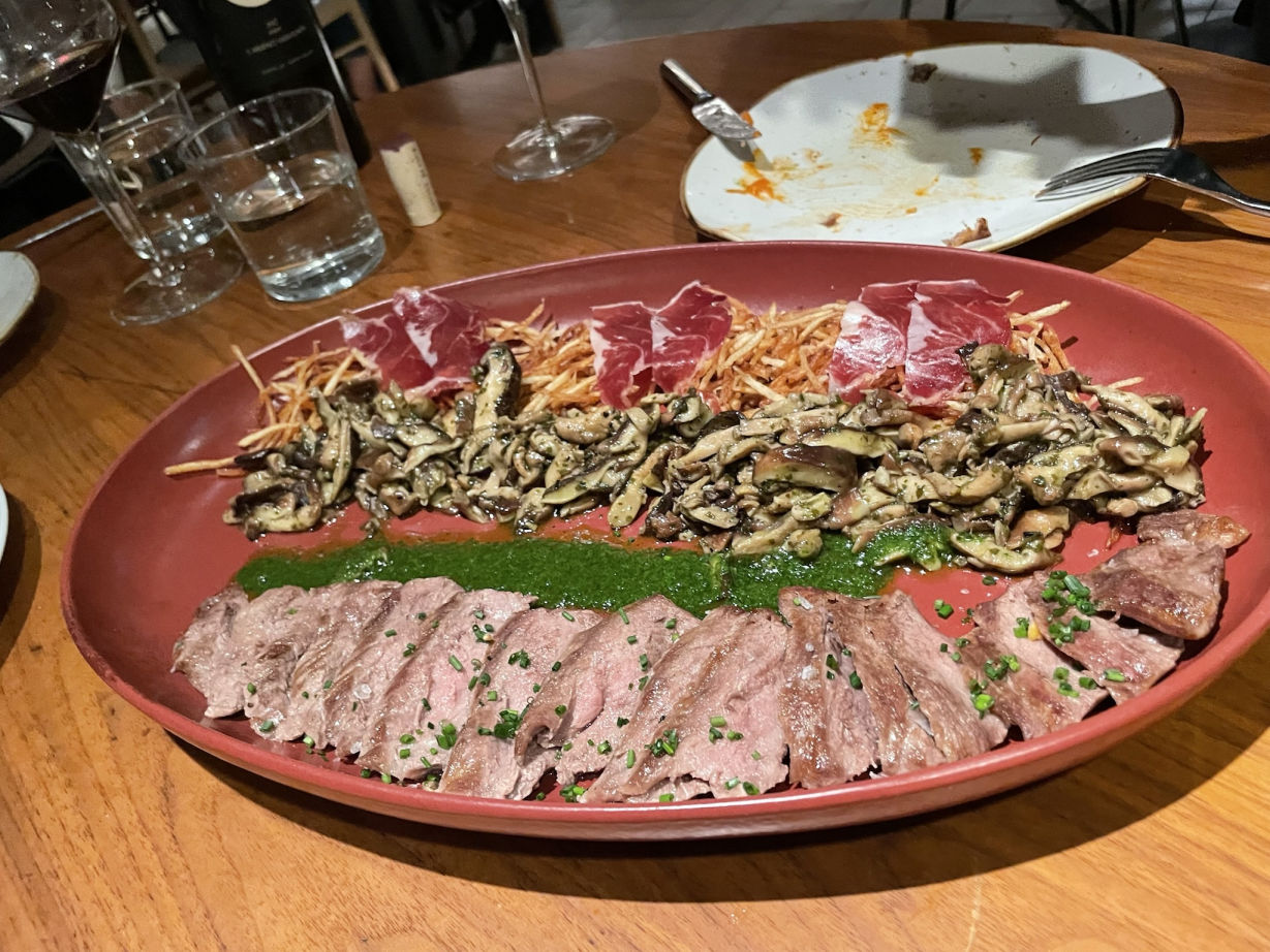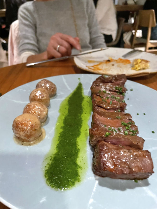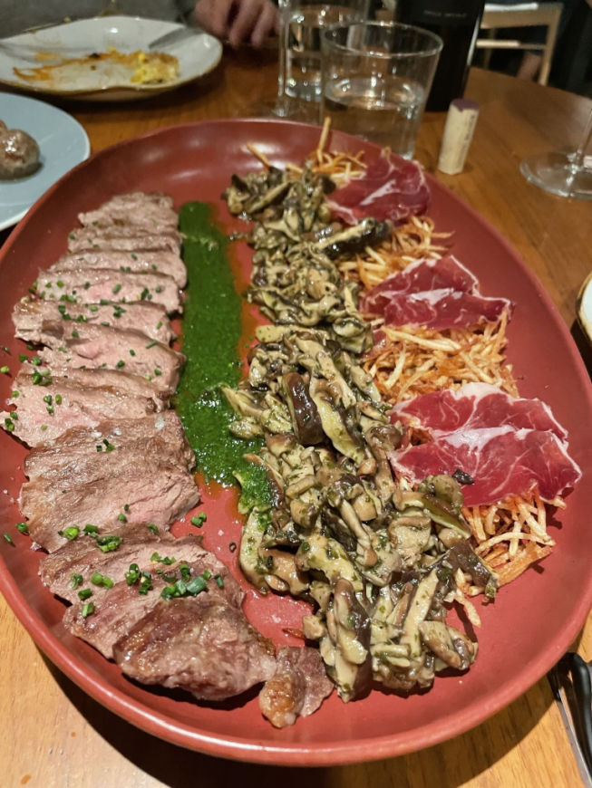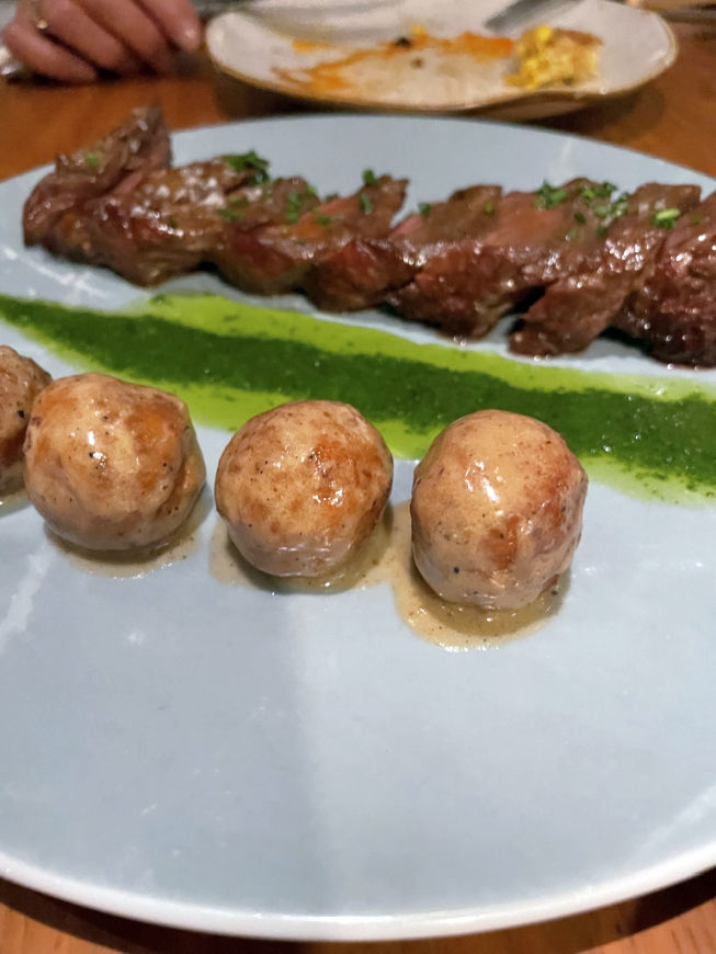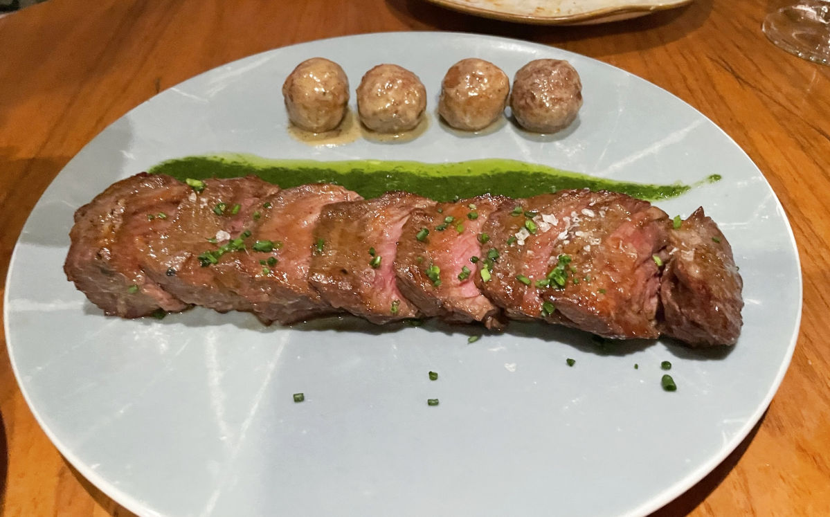 Grilled Hanger steak, demi-glace and Spanish gnocchi