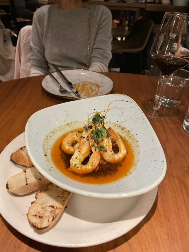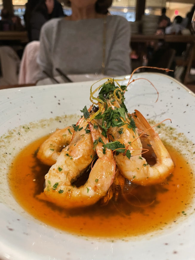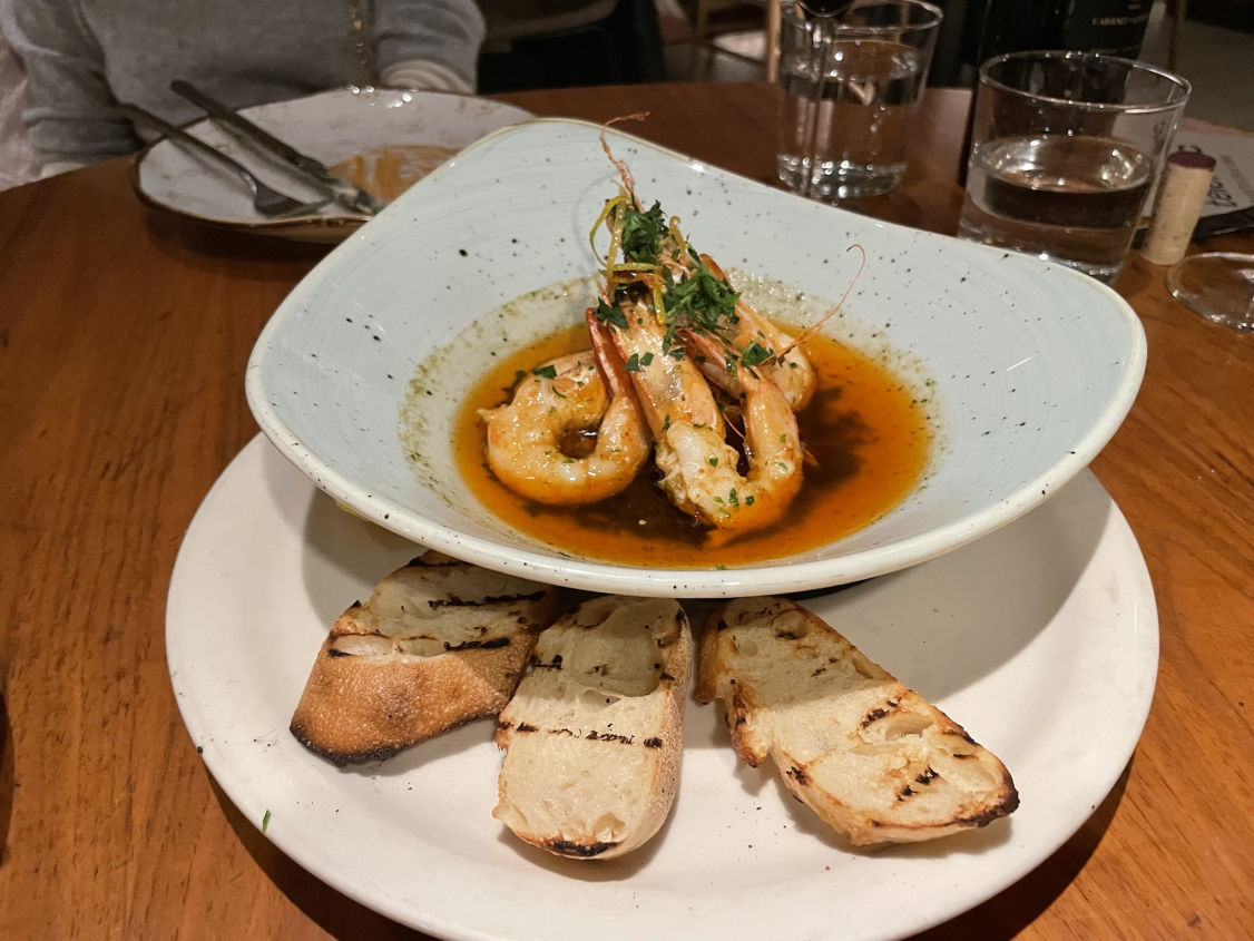 Gulf shrimp, lemon zest served with crispy garlic bread.