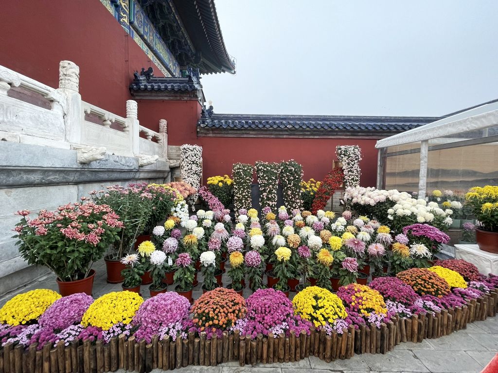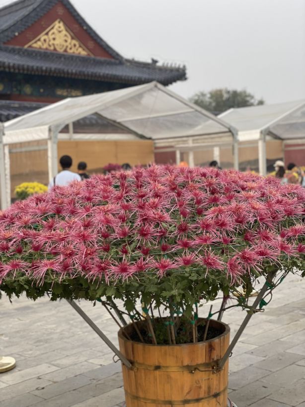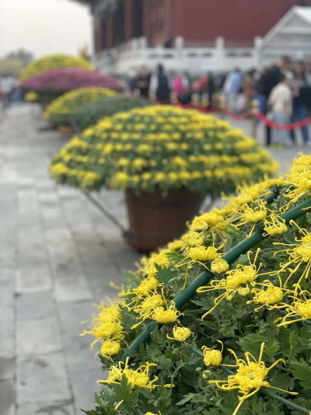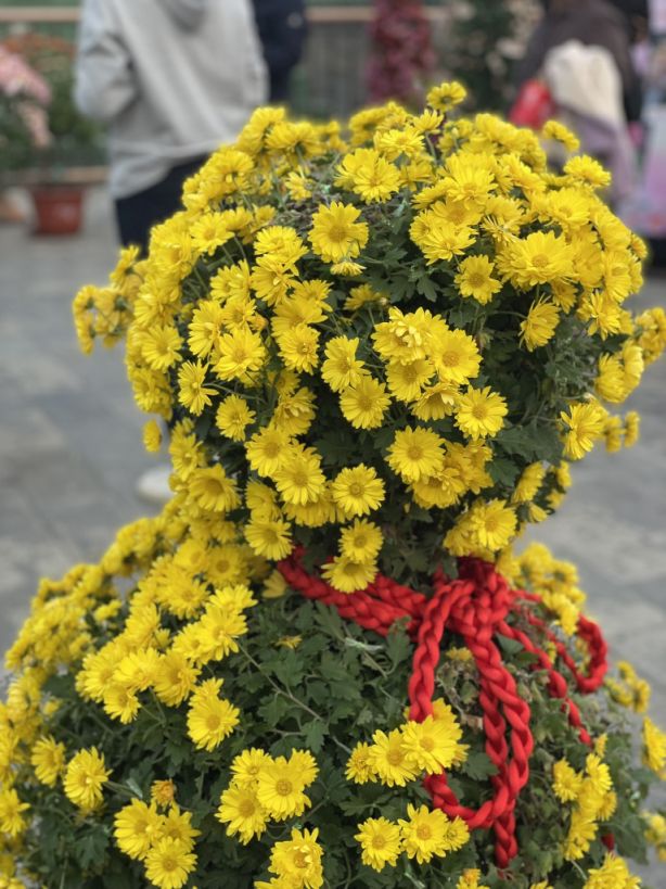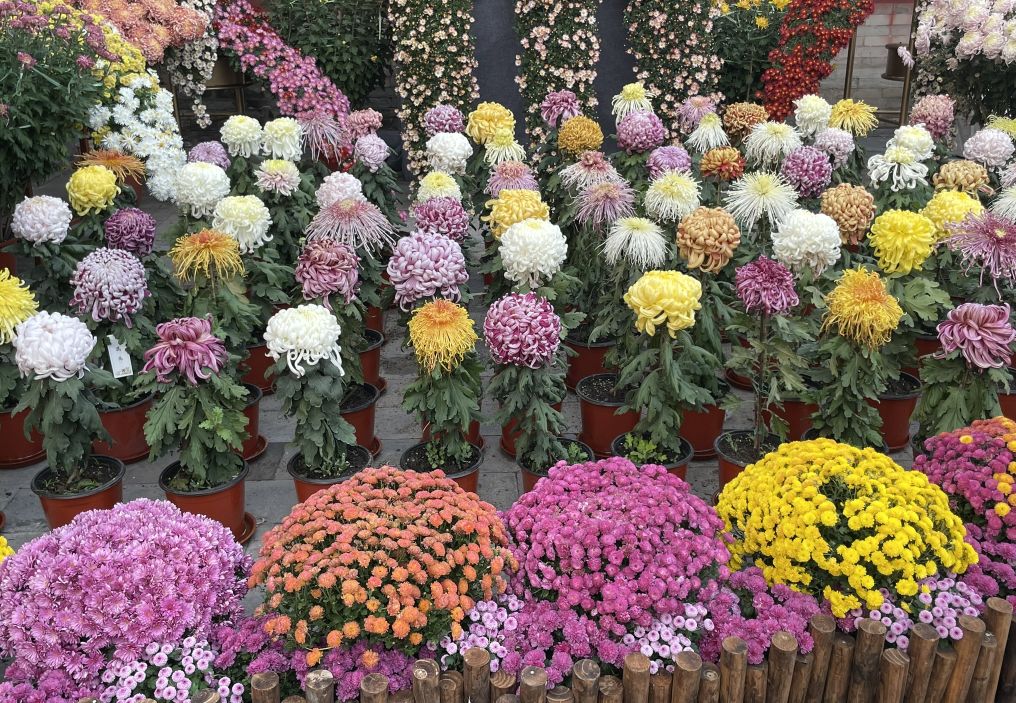 Beautiful chrysanthemum arrangements in the courtyard. The chrysanthemum carries the symbolic meaning of devoted love, loyalty, happiness, longevity, and joy.