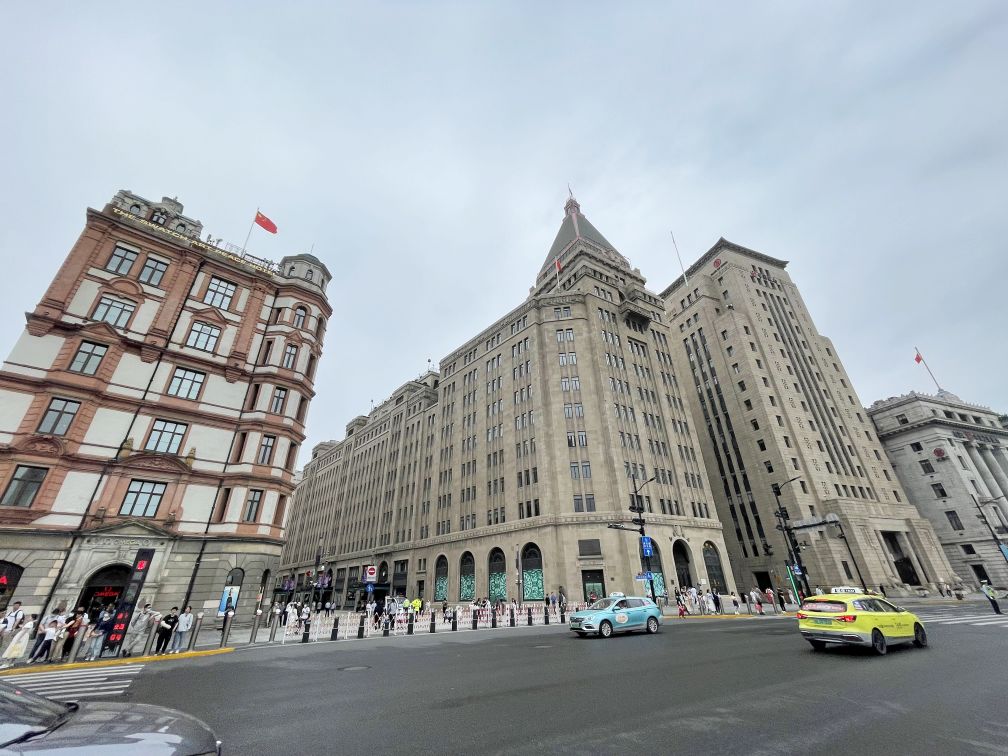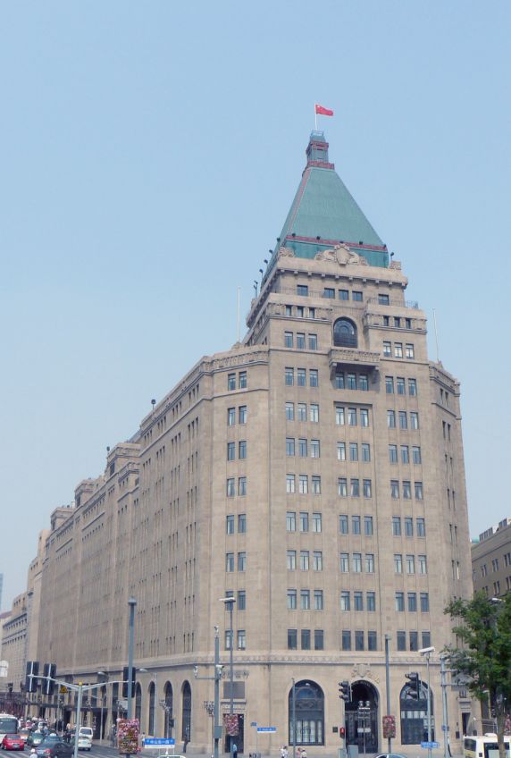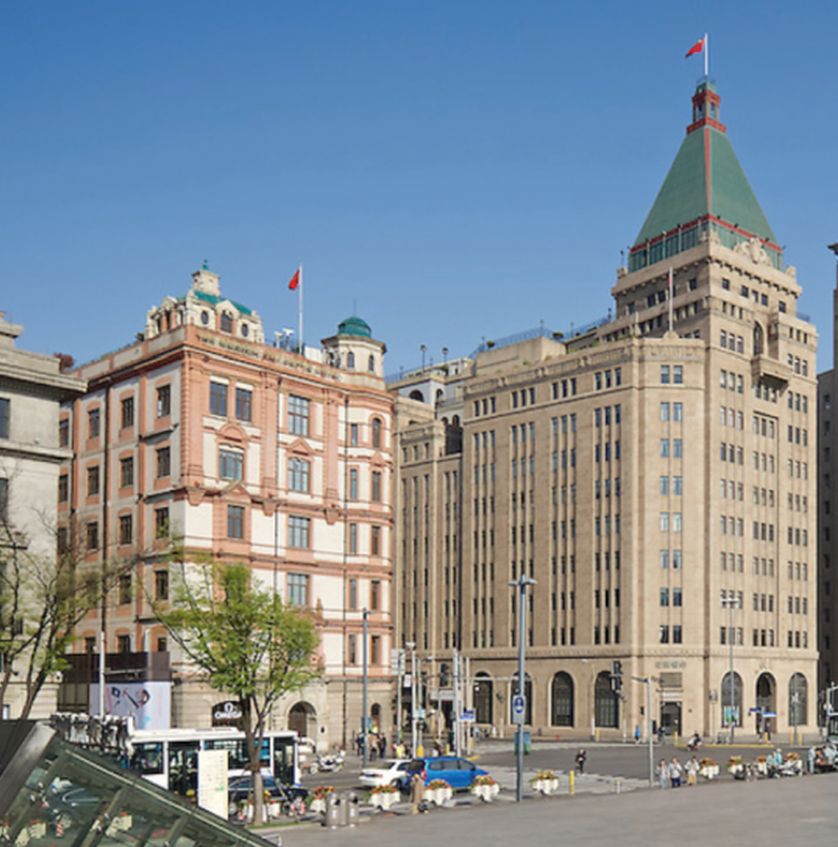 The former Palace Hotel (on the right) was built in 1906 and features a brick and wood structure of Renaissance style. The Hotel was widely known as the luxurious number one mansion of the Far East, due to its prime location along the Bund. Renovated in 2010 and it is now the Swatch Art Peace hotel.