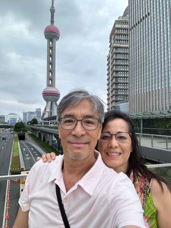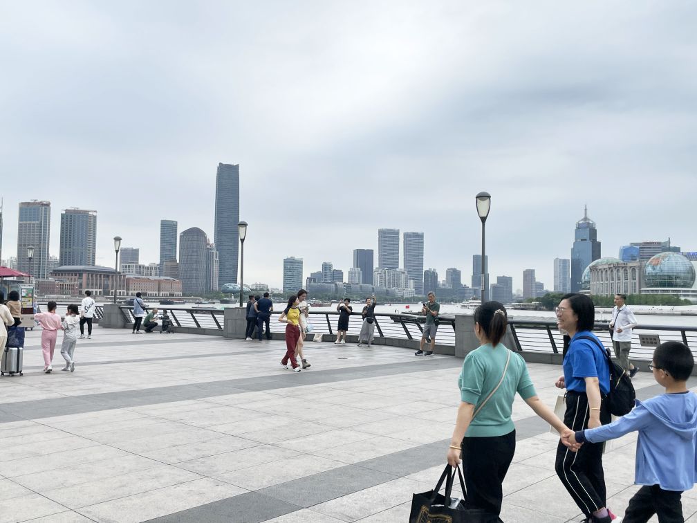We are on Nanjing Road over looking at the bund and in the distance is Pudong District with all the tall buildings.