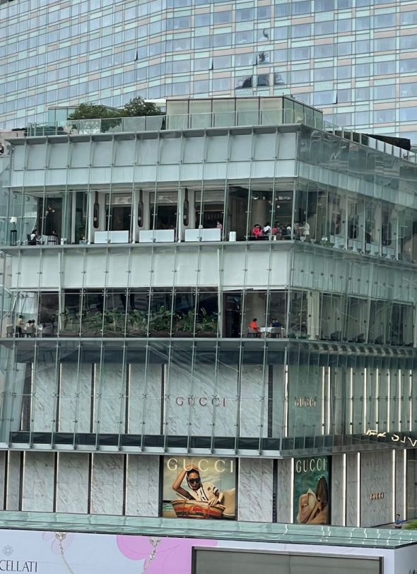Walkway between buildings. On the right is the Bank of China Tower. It was one of the three buildings that were part of the filming of Mission: Impossible III starring Tom Cruise. It is the building where Tom Cruise did a bungee jump.