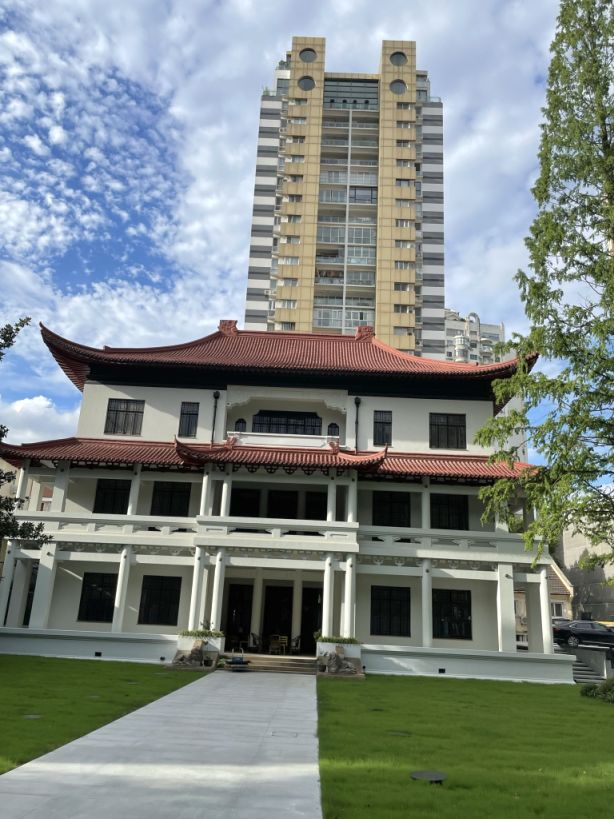 Old next to new architecture. The 3 story concrete building with a large convential Chinese roof was built in 1930 is a historical building.
