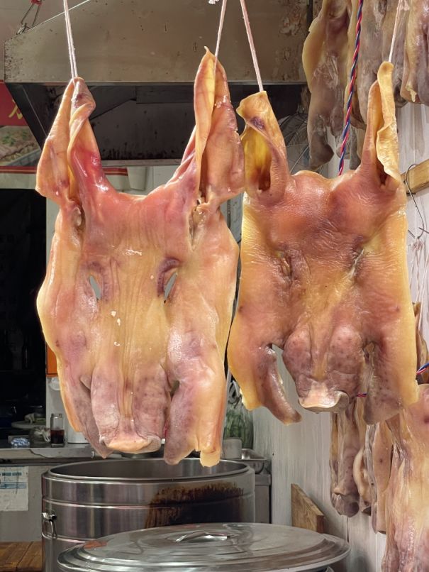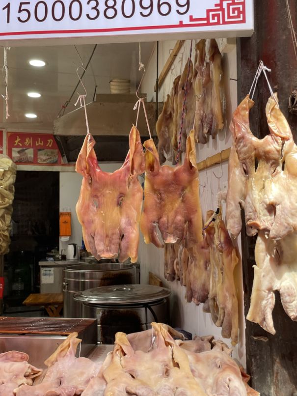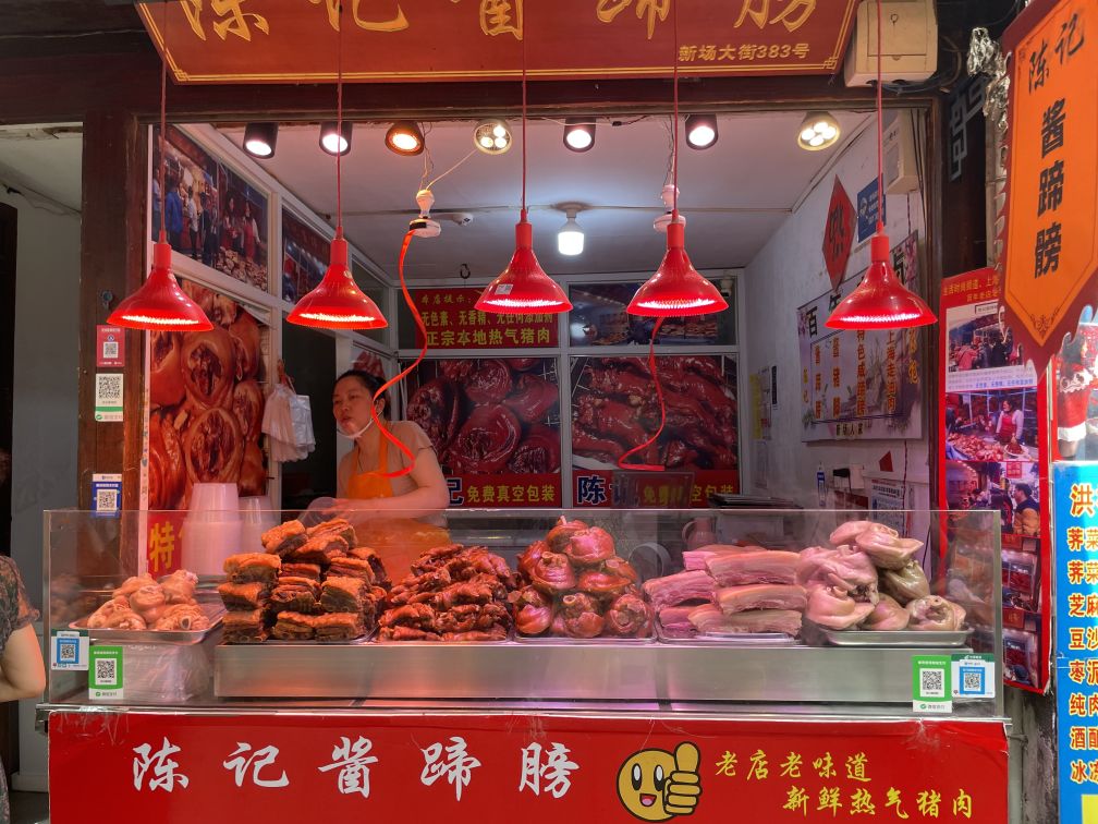 This store is selling cooked pork belly, pig trotters, etc...