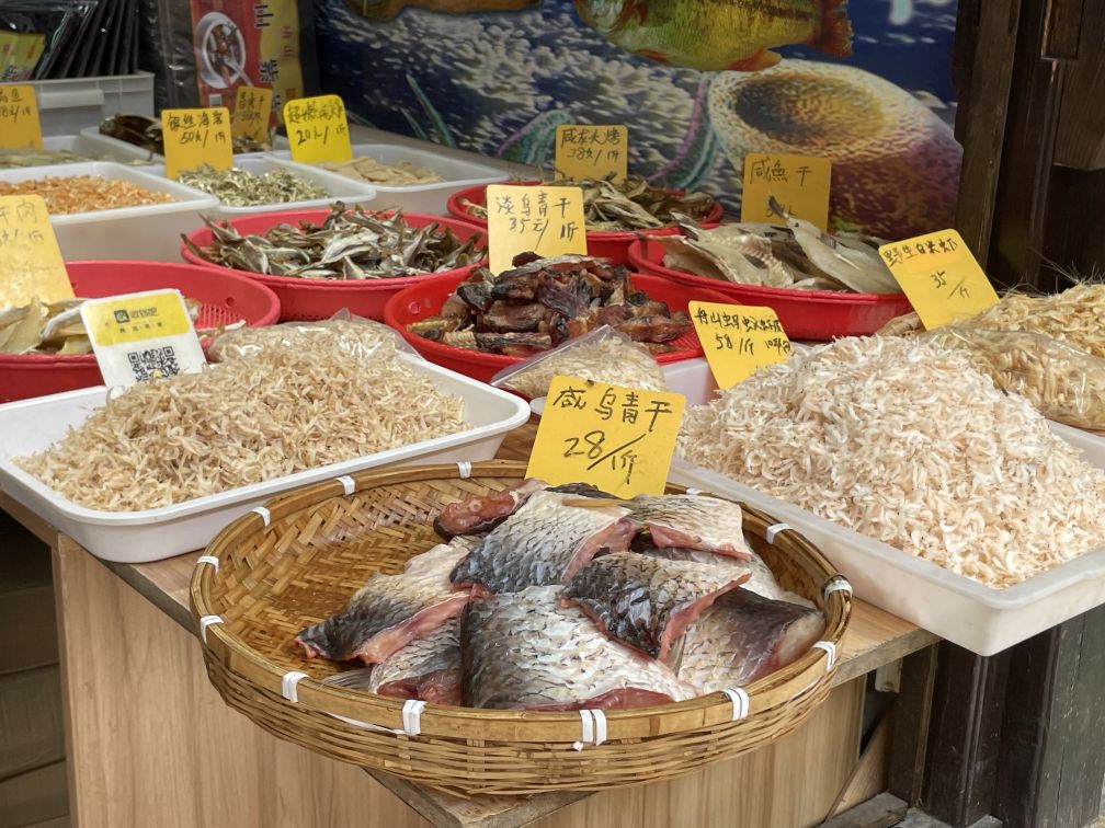 A stall selling fresh and dried fish.