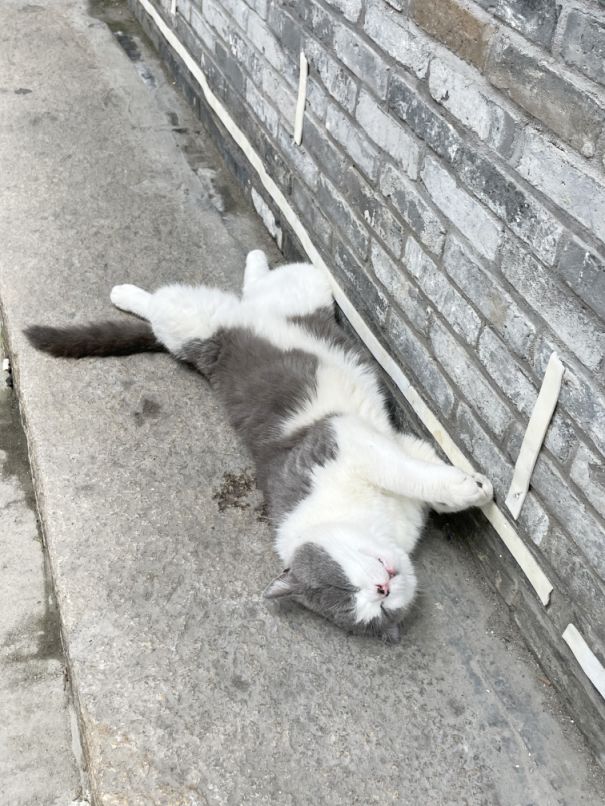 A cat dozing off on the curb.