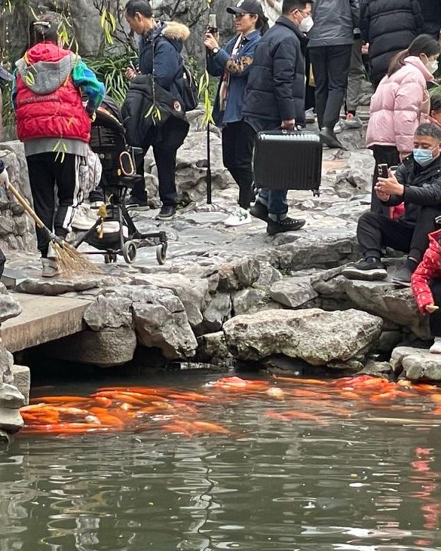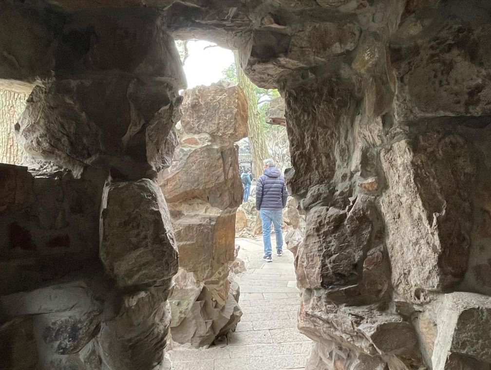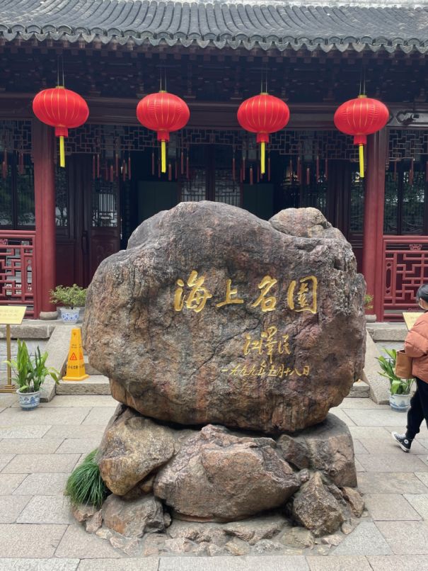 A 39 ft. high formation made of 2,000 tons of rare yellow stones brought all the way from Wukang in Zhejian province. Each rock you see here was fused to the other using a combination of rice glue and limestone to create a formation that essentially evokes a mini landscape of cliffs, winding path an gorges that was designed by Zhang Nanyang, a famous garden artist.