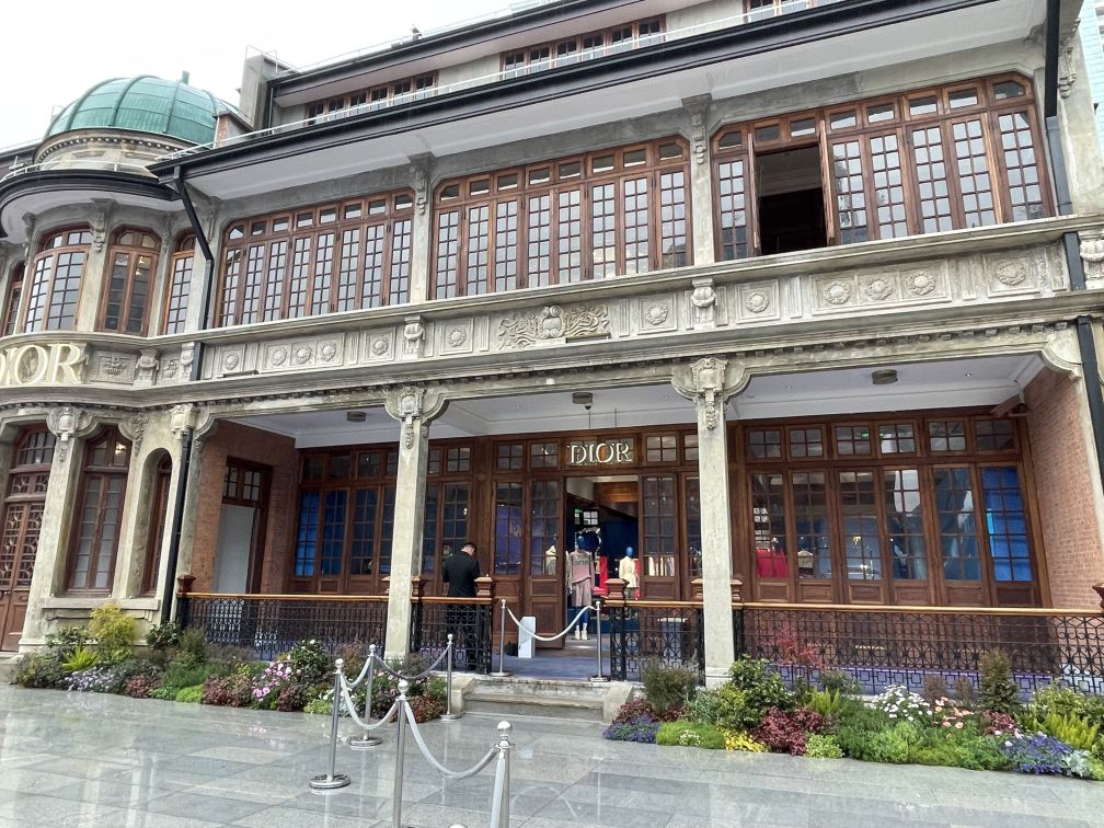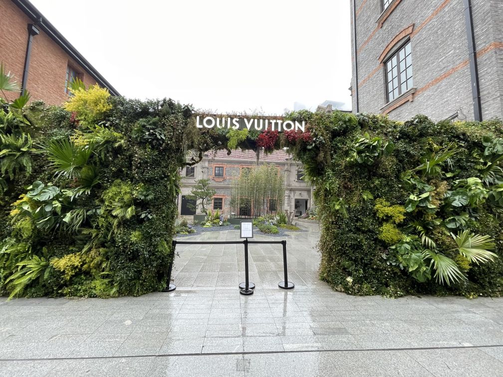 Louis Vuitton store with an exterior gate overlooking a beautiful courtyard.