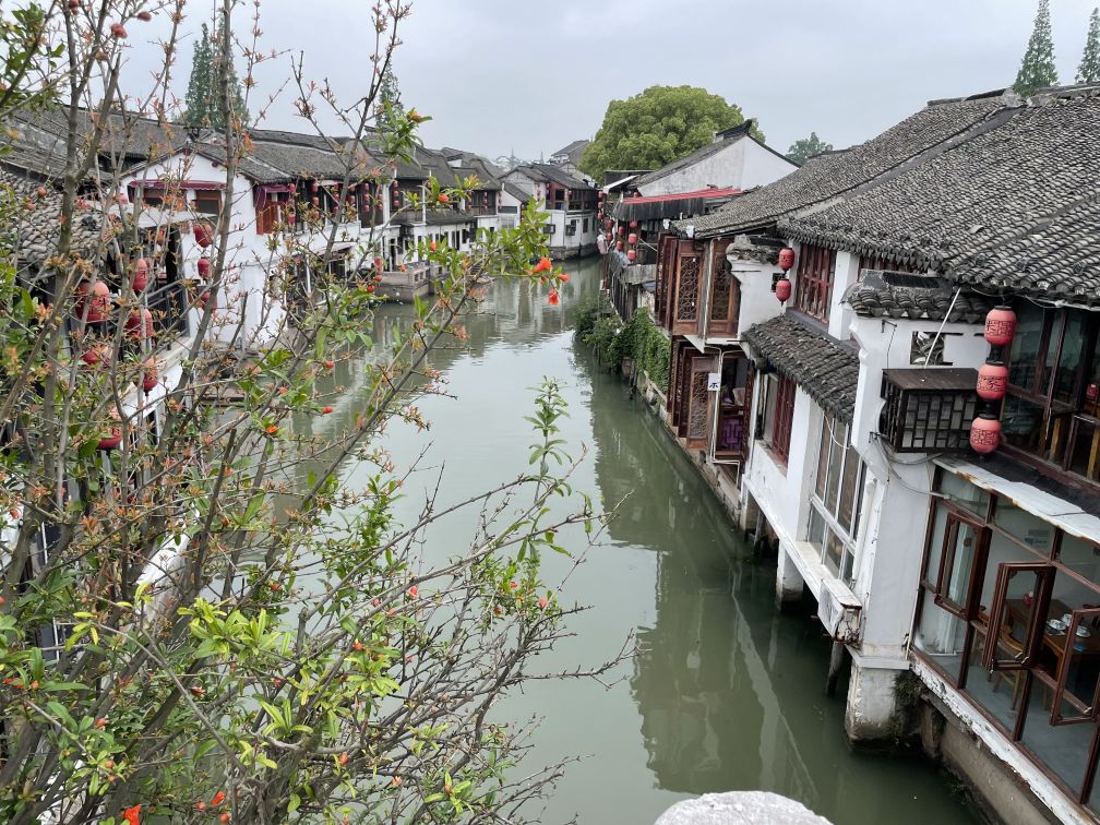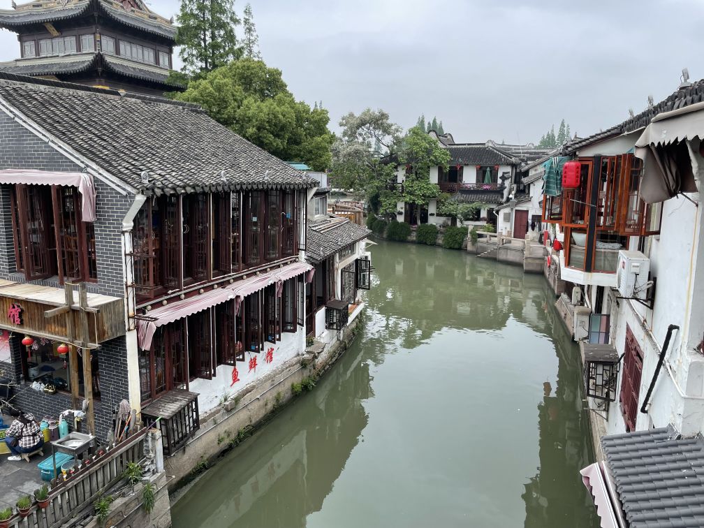 View of the canal and the two banks from the top of one of the many bridges in Zhujiajiao.