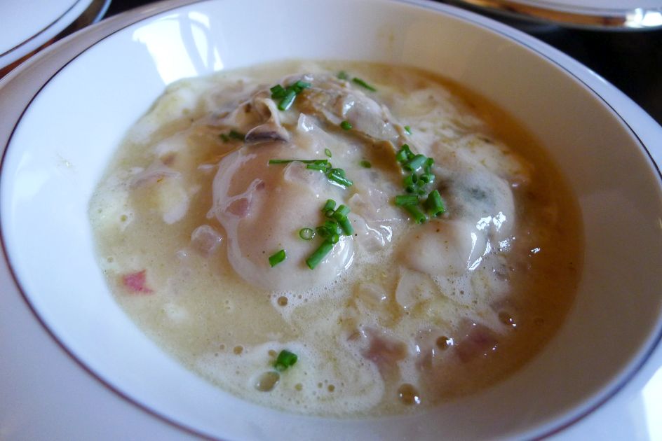 Oysters and Pearls dish is made with a sabayon (sabayon is made by beating egg yolks with a liquid over simmering water until thickened and increased in volume) of Pearl Tapioca with Oysters and Caviar.