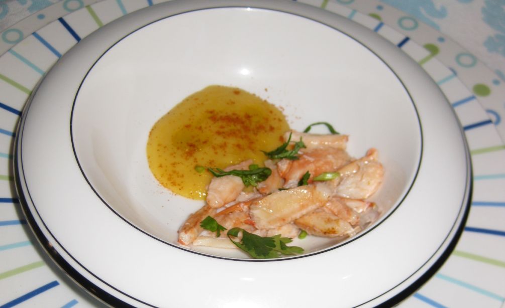 This dish is a hearty and rich soup that is thickened with corn purée and topped with fresh lump crab. The soup is unusual in a sense that I spiced it up a bit with star anise and lemon grass. You cannot really taste these 2 ingredients in the soup but there is a lingering taste that you are not quite sure what it is...