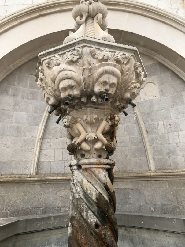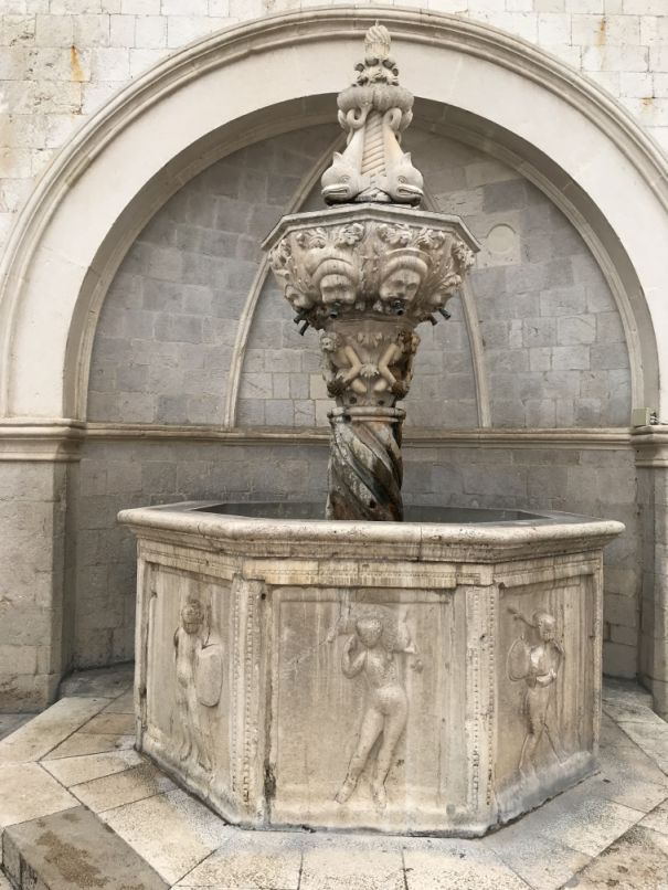 This is the small Onoforio fountain Located on the other end of Stradun, in the corner of the Luza Square, next to the entrance from Ploce Gate.