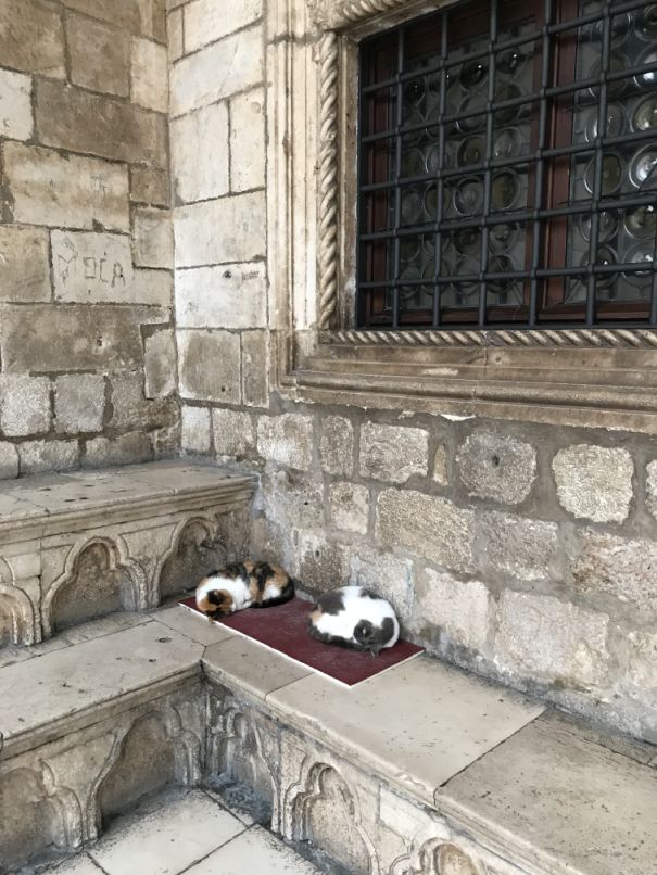 Stray cats are taking refuge from the rain on the steps of the Rector's palace. Somebody put a mat there for them to be comfortable and I guess they are welcome to roam around. |