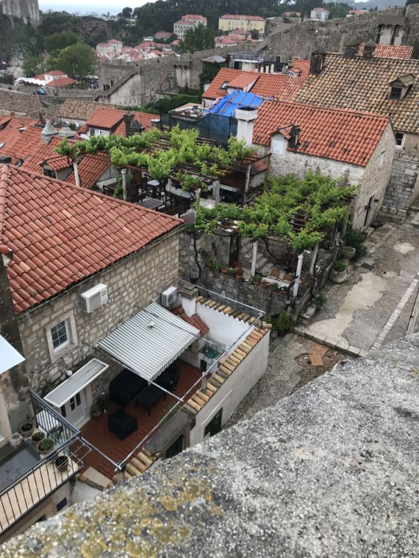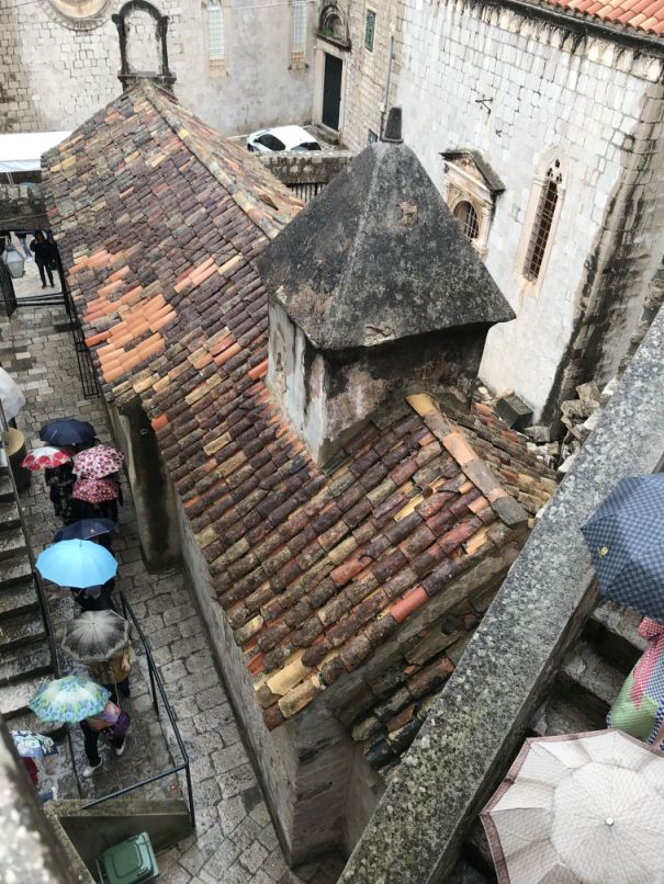 As you look down at the town, notice the patchwork of colors formed by the red roofs. Some are brand-new and some are centuries-old. The shelling of 1991 left gaping holes Dubrovnik's distinctive terra cotta roofs. Some were repaired with tiles from a factory in Slovenia, some came from Agen, France but most were produced in northern Croatia.