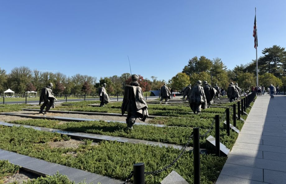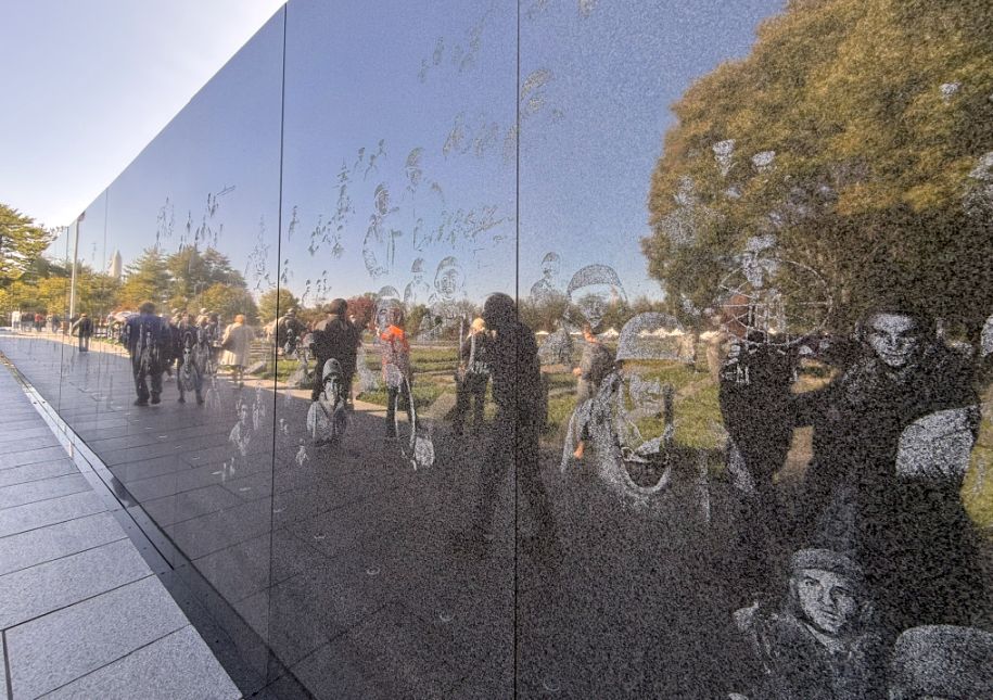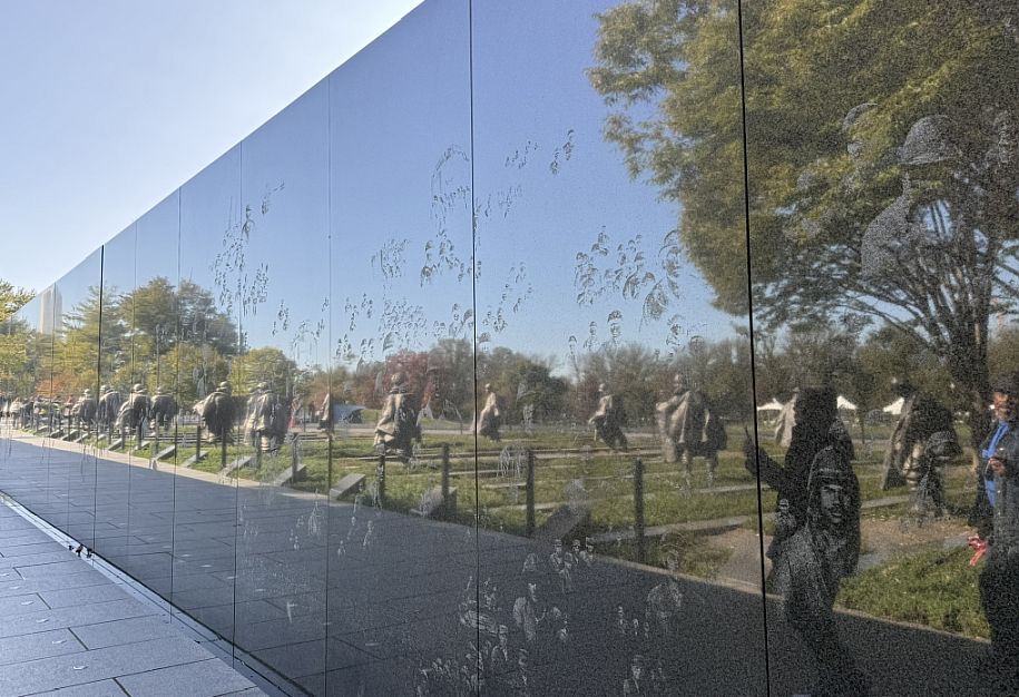 Running alongside the statues is a 164-foot-long wall made of highly polished Academy Black granite. It serves as a tribute to the millions of support troops who enabled the front-line soldiers to fight. While there are 19 physical statues, their reflection in the polished granite mural wall creates the image of 38 soldiers. This symbolizes the 38th Parallel (the border between North and South Korea) and the 38 months the war lasted. From a distance, the arrangement of the etched images and the shadows they create mimic the silhouette of the Korean mountain ranges.