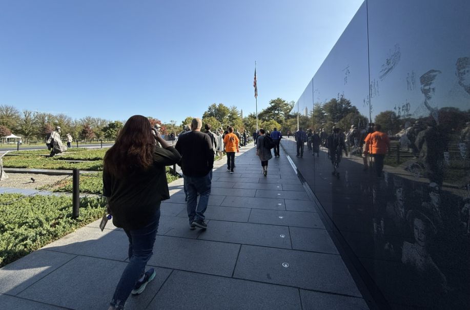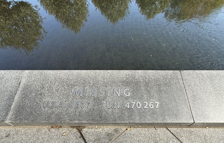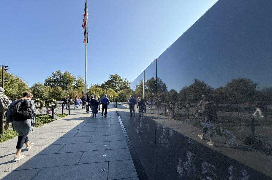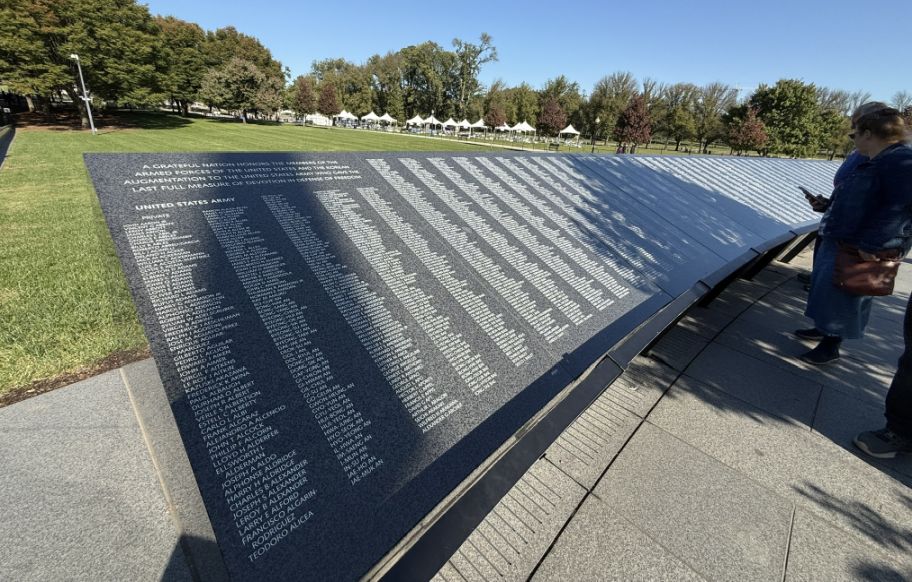 Just beyond, the granite wall of names stretches out, row after row, individual lives pulled back out of the statistics and given their own place to stand.