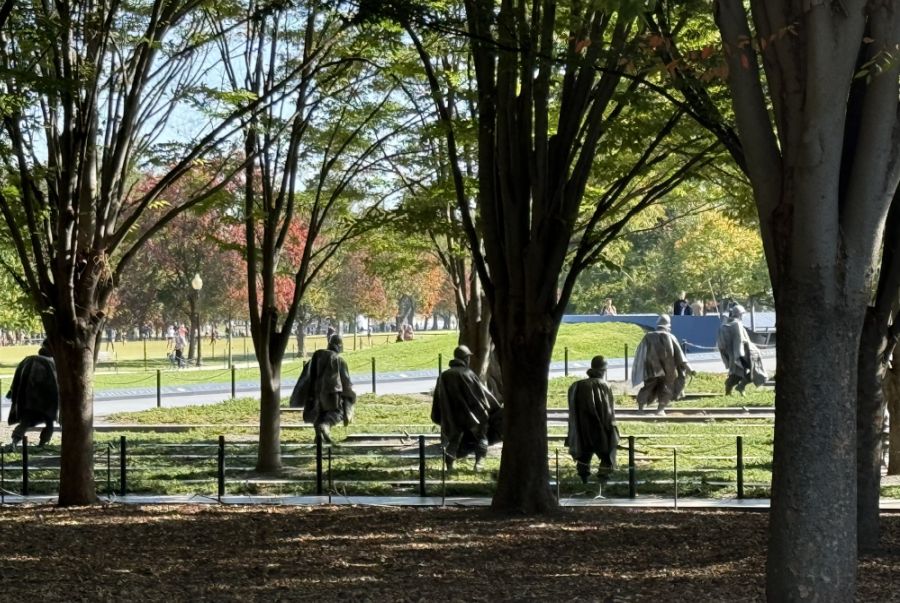 The walk toward the memorial feels almost deceptively calm at first. We are moving through open green space, and ahead, far off, there’s just shape and shadow. At that distance the soldiers aren’t yet people. They read as silhouettes pressed low against the horizon, dark forms rising from the ground, as if the land itself has grown figures.