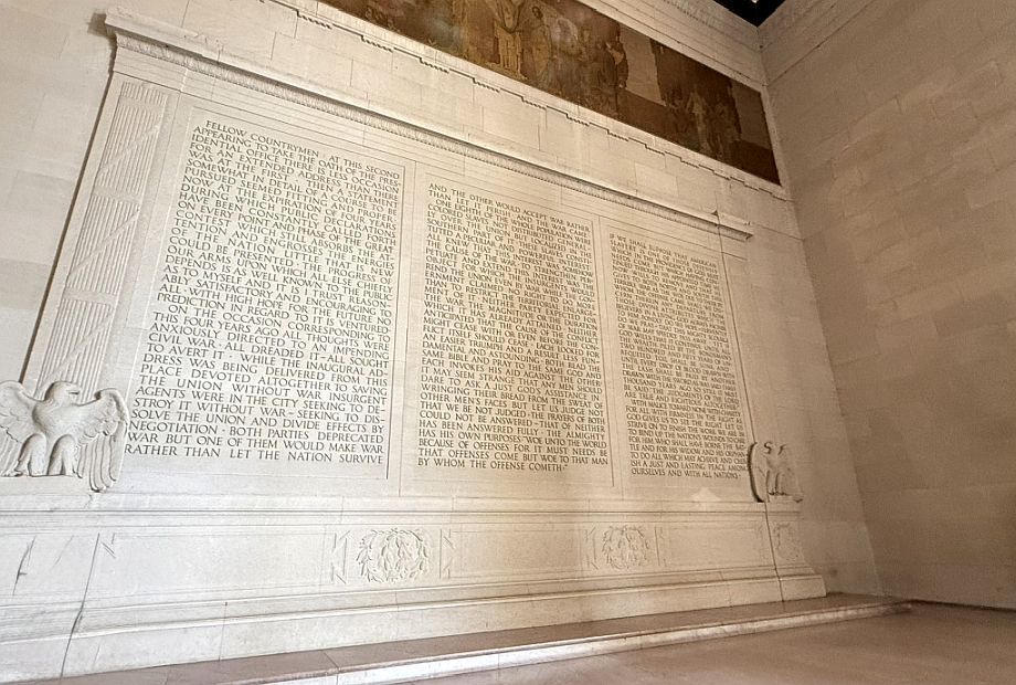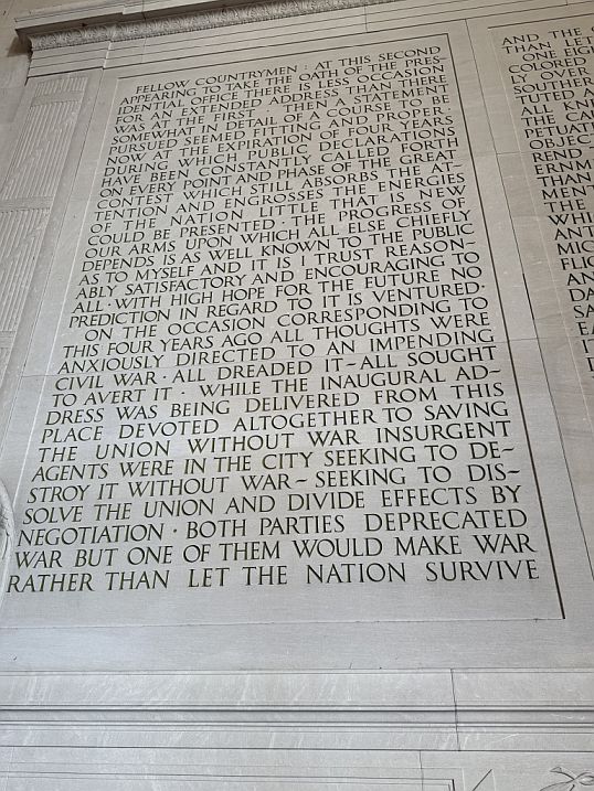 This large wall with the three panels contains Lincoln’s Second Inaugural Address, delivered on March 4, 1865, as the Civil War was nearing its end. It is widely considered one of the most profound speeches in American history.