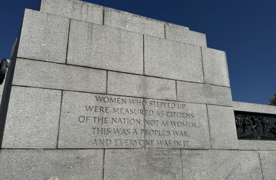 This inscription honors the roughly 350,000 American women who served in the armed forces, as nurses, pilots, mechanics, radio operators, clerks, and in countless other necessary roles, and the millions more who supported the war effort in factories, farms, and homes.