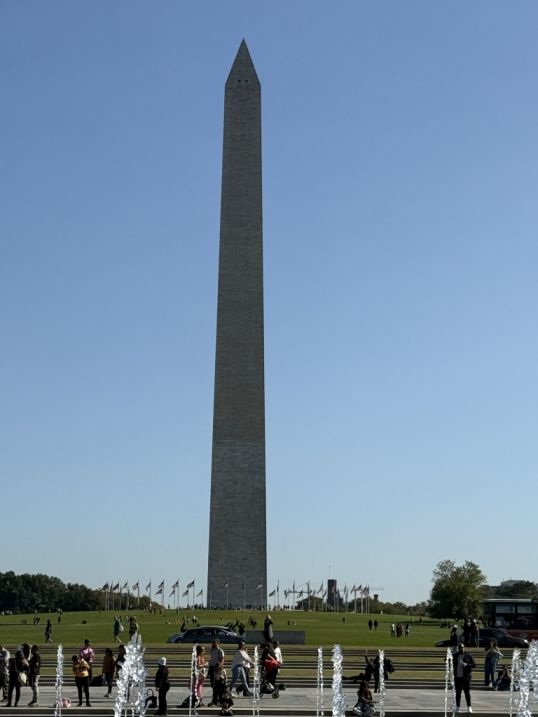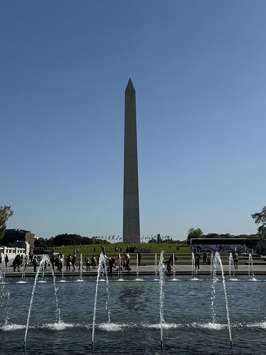 The Washington Monument, tall and serene against the sky, symbolizes the permanence of democracy and the strength of the principles for which those who served fought. Its reflection in the pool ties the present moment to history — unity, perseverance, and hope. When the day is calm, you sometimes see the tip of the monument shimmering in the rippling water among the arcs of the fountains below — symbolizing both remembrance and renewal.