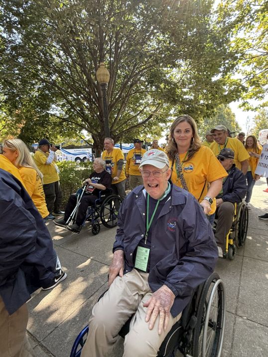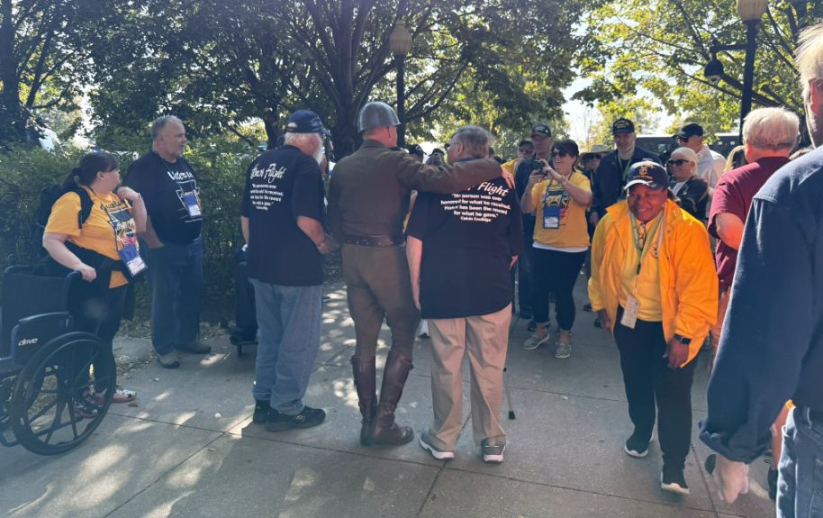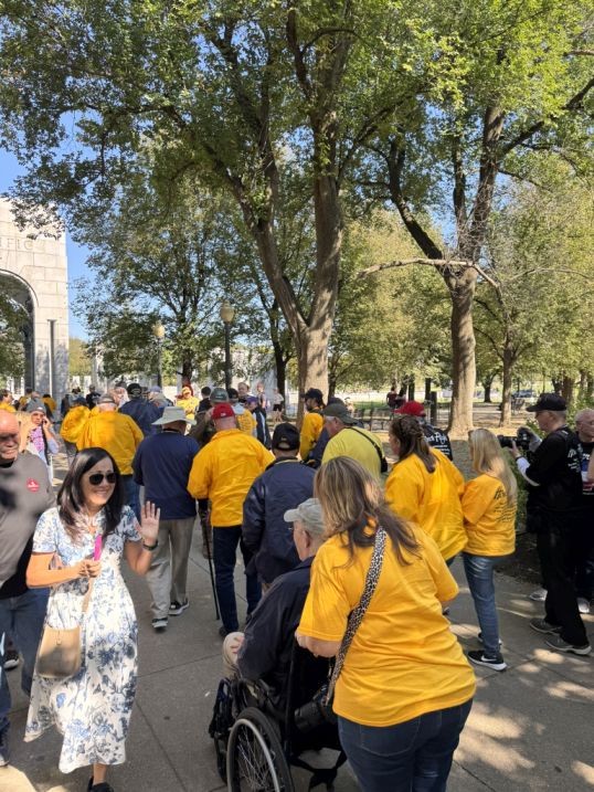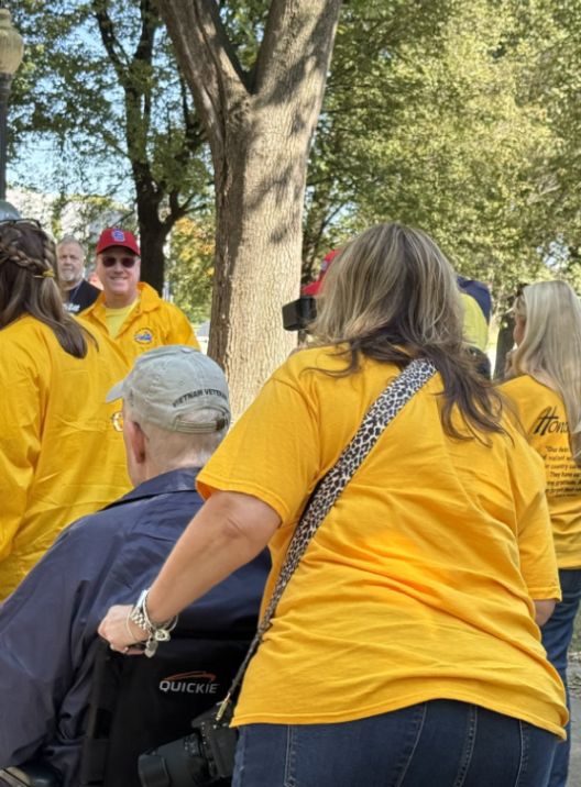 The volunteers in yellow shirts are typically guardians, each assigned to accompany and assist a veteran for the day, helping them move comfortably between memorials, taking photos, and sharing in their stories. Many visitors and passersby hold thank you signs, often spontaneously, to show appreciation and respect for the veterans’ service.