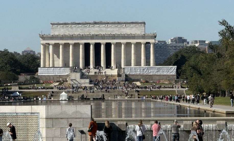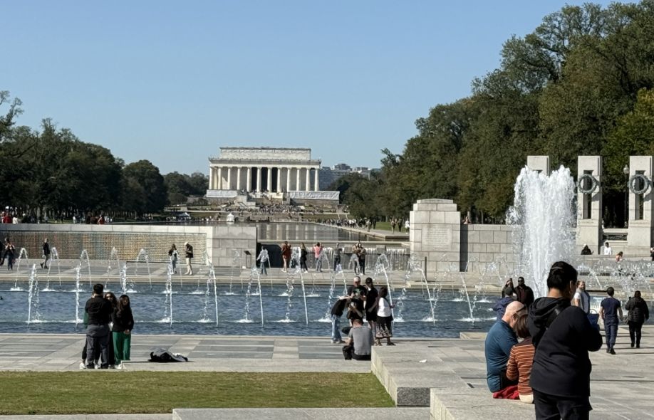Beyond the pool, perfectly aligned, is the Lincoln Memorial, anchoring the scene with its calm authority. The alignment is deliberate, a visual line connecting: Lincoln’s struggle to preserve the Union, and to the global fight to preserve democracy.