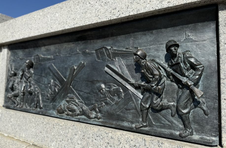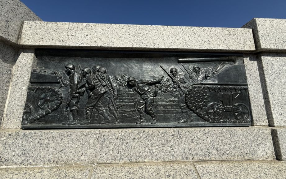 Along the pathways leading into the memorial, there are a series of bronze bas‑relief panels, sculpted story panels mounted into the stone walls. These panels, created by artist Ray Kaskey, depict moments from both the European and Pacific theaters and from the home front during World War II. Bronze bas-relief panels are arranged in a long sequence, almost like pages in a book. They show scenes from home and from the front, carved in a slightly rough, muscular style that feels busy and crowded on purpose.