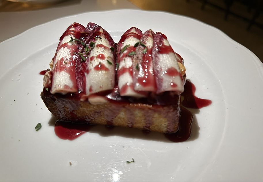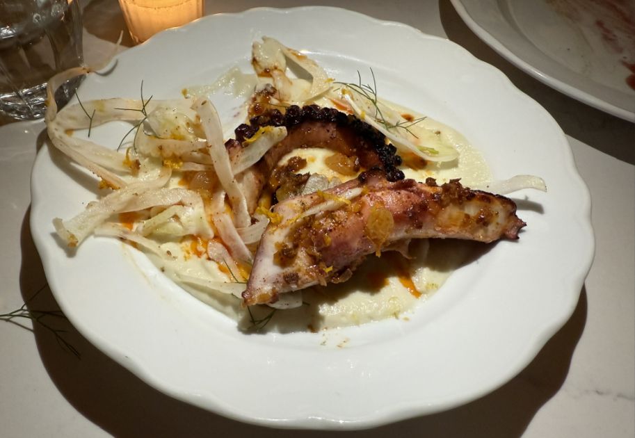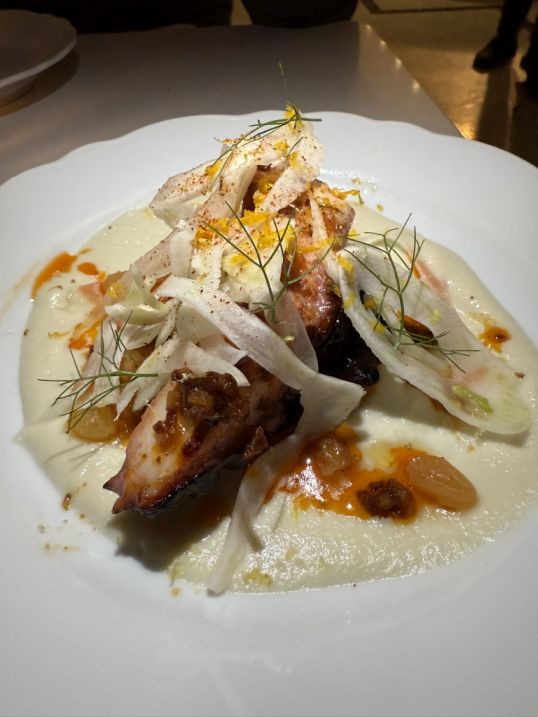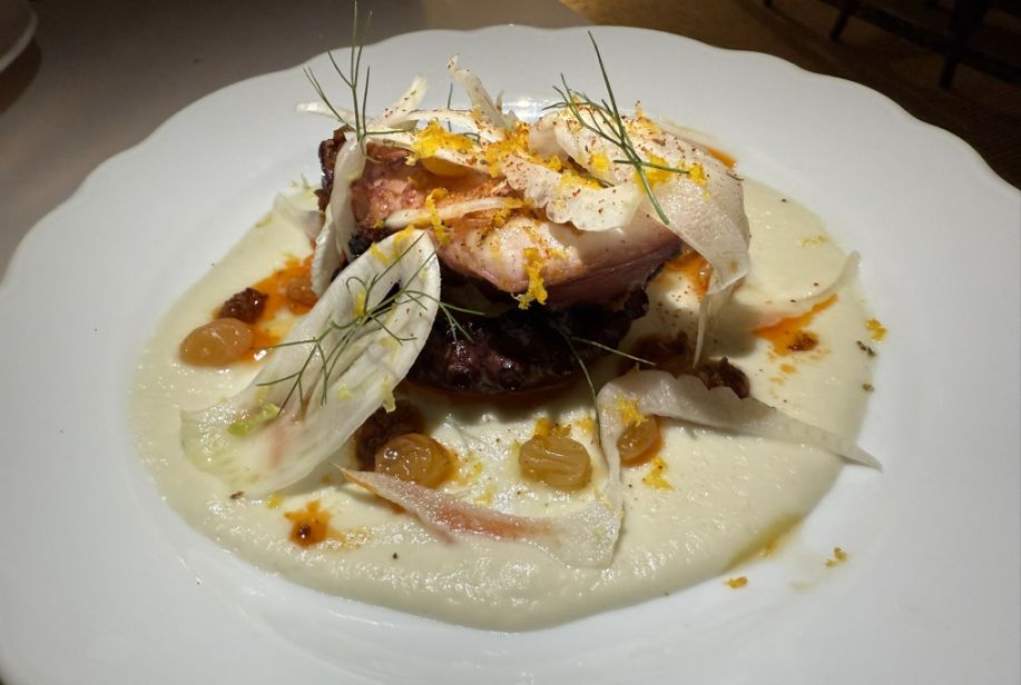 Grilled octopus, when done well, is tender with a slight char that adds smokiness. The fennel contributes freshness and subtle licorice notes. Saucisson basquaise (a Basque-style sausage) introduces spice and depth. Then the golden raisins and orange brighten the plate with sweetness and acidity. It’s a dynamic mix, smoky, sweet, citrusy, and savory, layered but harmonious.