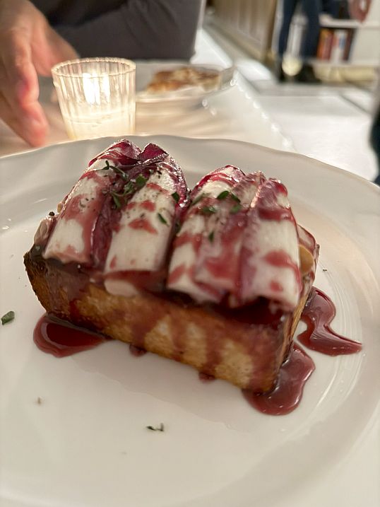 Homemade brioche, foie gras mousse, endives, roasted beets juice,