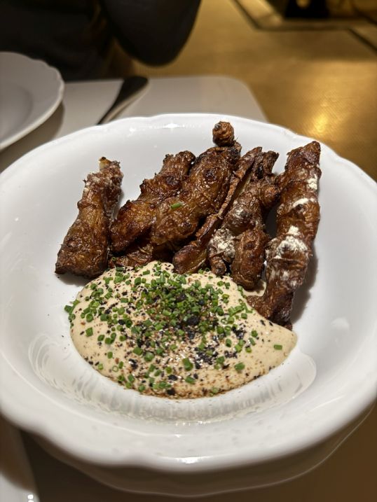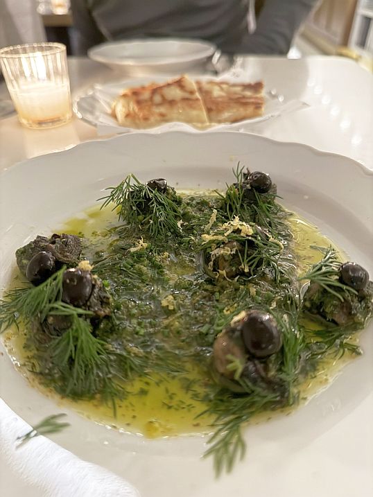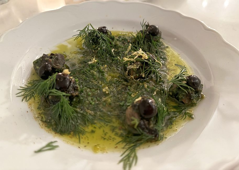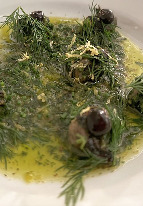 This dish is a creative, modern take on a French classic. The escargot was tender and buttery, but instead of the traditional parsley-garlic butter, the dill chermoula added a bright, herbaceous, slightly North African twist. The black garlic brought a deep, sweet umami richness.