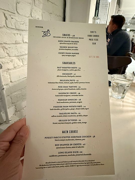 The meal flowed beautifully: flavorful escargot with dill chermoula and black garlic, rich brioche with foie gras mousse balanced by endives and beet, tender grilled octopus with bright citrus notes, and a perfectly cooked Long Island duck with warm autumn accompaniments. We finished with a classic crème brûlée and a delicate madeleine, a simple and elegant ending to a truly delightful dinner.