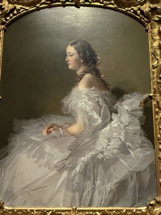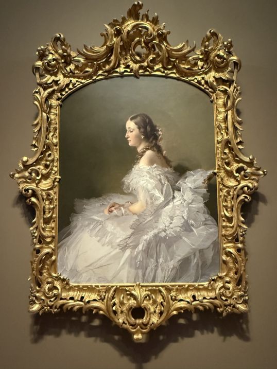 Franz Xaver Winterhalter became much sought after in the courts of Europe, especially after his successful portraits of both the young Queen Victoria as well as the Empress Eugénie of France. He was particularly trusted by aristocratic women to produce highly flattering portraits that simultaneously celebrated and recorded their youth, status, good taste, and fashion sense (their gowns were usually designed by Worth, to Winterhalter’s own specifications). In this portrait of Baroness Staël-Holstein, the viewer is confronted with a stunning image of an aristocratic woman, painted at the height of her youth, with the artist paying much attention to the details of the sitter’s costume, jewelry, and hairstyle. In Second-Empire France (1852–1870), fashion and identity were tightly intertwined. Here Winterhalter, who knew how best to serve the needs of his patrons, skillfully draws the viewer’s attention to his subject’s mauve gown through his bold brushwork. To better highlight the sitter, the artist has deployed a drab and dull brown background, which creates a rich contrast with the light and feminine material of the dress. The dress itself is composed of layer upon layer of explosively luxurious fabric, and it subtly mirrors the flower in the sitter’s hair, which is made up of layers of soft and colorful petals and is the ultimate symbol of feminine beauty.