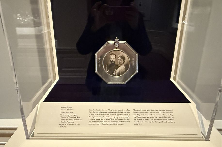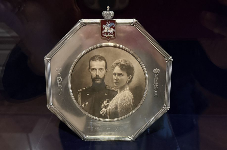"TSAR NICHOLAS II" and "EMPRESS ALEXANDRA" The silver frame itself is a beautiful Fabergé piece, typical of the fine craftsmanship associated with the firm, often given as imperial gifts or commemorative items. The frame was originally designed to hold a photograph of Grand Duke Sergei Alexandrovich and Grand Duchess Elizabeth Feodorovna. The current photograph (of Nicholas II and Alexandra) means that either the frame was repurposed or it's a display decision by the museum.