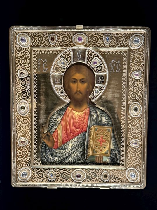 On the left is Christ Pantocrator, 1914-17. oil on panel, silver gilt, silver, garnets, sapphires, possibly topaz, zircon, chrysoberyl, diamonds, pearl, velvet by Fabergé Firm