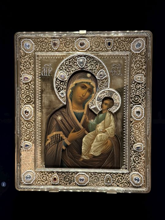 On the right is The Iverskaya Mother of God, 1914-17, oil on panel, silver-gilt, silver, garnets, sapphires, topaz, zircon, tourmaline, pearls, velvet.