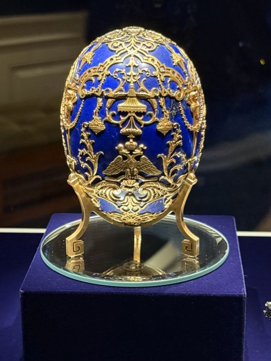 The Imperial Tsarevich Easter Egg was presented by Tsar Nicholas II to his wife, Empress Alexandra Feodorovna, in 1912. The egg is cleverly constructed to appear as if it is carved from a single piece of lapis lazuli. It actually has six lapis lazuli sections. The joints are concealed under the elaborate gold decorations that include double-headed eagles, a symbol of imperial Russia. The top of the egg is set with a table diamond (a thin, flat diamond) that covers the Cyrillic monogram AF (for Alexandra Feodorovna) and the date 1912.