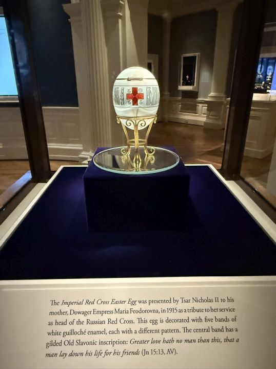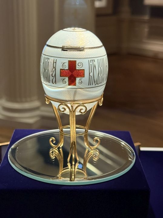 The imperial Red Cross Easter Egg was presented by Tsar Nicholas II to his mother, Dowager Empress Maria Feodorovna, in 1915 as a tribute to her service as head of Russian Red Cross. This egg is decorated with five bands of white guilloche enamel, each with a different pattern. The central band has a gilded Old Slavonic inscription: Greater love bath no man than this, that a man lay down his life for this friends.
