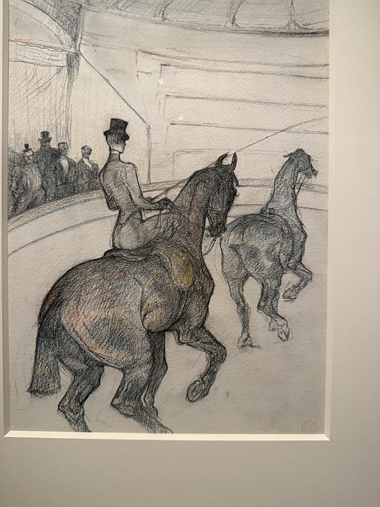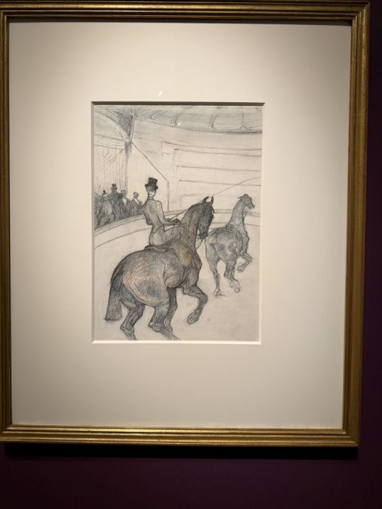 The circus grew popularity at the end of the 19th century. Alongside other forms of spectacular entertainment like the cabaret. Toulouse-Laurtrec frequented these venues, where he felt a sense of camaraderie with the performers. This drawing is one from a series he made while a patient a sanatorium outside Paris. Toulouse-Lautrec hoped that the drawings would convince his doctors that he was well enough for release.