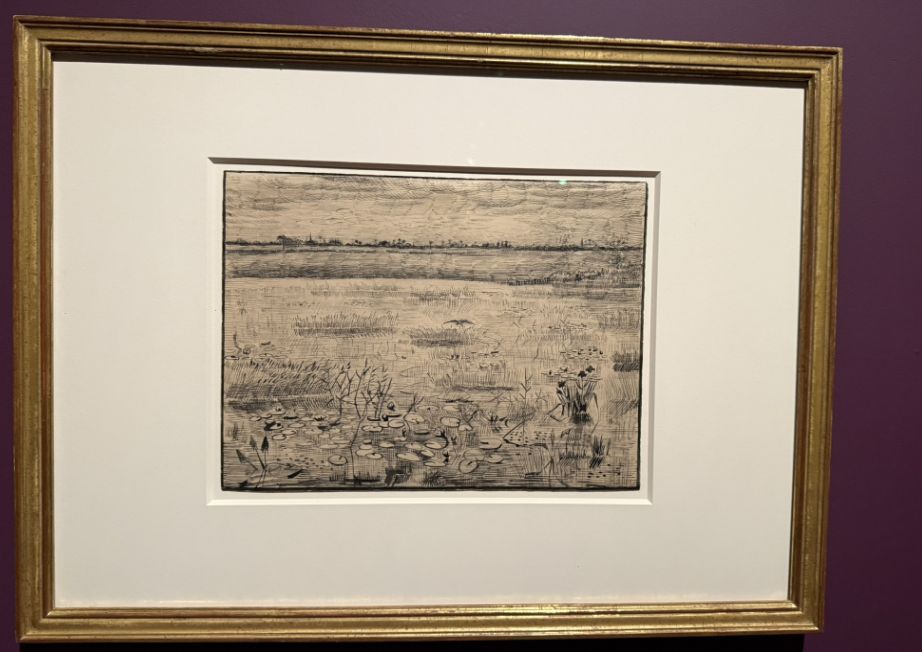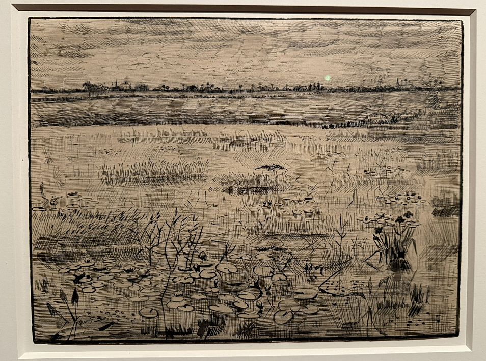 Van Gogh spent some of the summer of 1881 with his family in the Dutch village of Etten. IN this early drawing, the skyline of the town, including church spires, are visible along the horizon, distinct from the repetitive marks that suggest the sky above and field in the mid-ground. Van Gogh employed this pattern application of line and crosshatching throughout the sheet to convey different surfaces, including reds and water lilies emerging through the surface a still pond. Yet even with this systematic approach to the composition, hints of the exuberant expressionism of his later work are clear, most notably in the dynamism of the sky