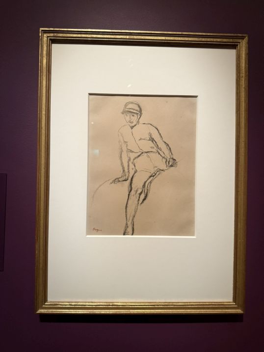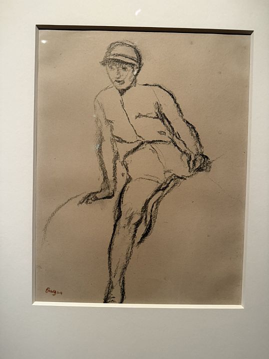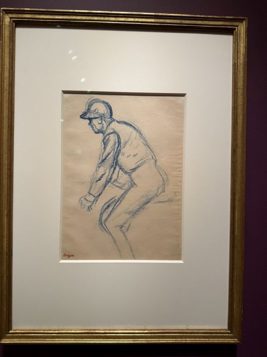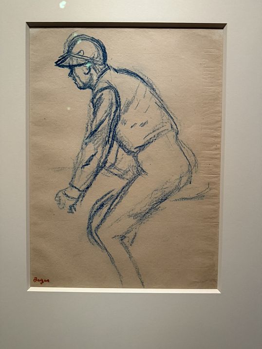 Degas was a frequent visitor to the racetracks at Longchamp in Paris an repeatedly depicted both riders an spectators. His immersion into the space gave him ample opportunities to study horses and jockeys both in motion and at rest. The Impressionist, especially Degas and Monet, became known for their seriality-returning to the same motif again and again. Throughout his career, Degas created works related to horses and racing in painting, sculpture, prints, and drawings. Drawings enables him to work on-site at the track, where it would not have been feasible to set up a easel.