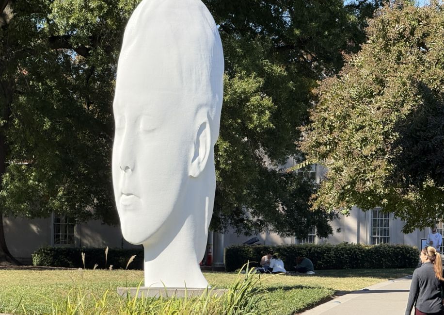 Awilda" by Jaume Plensa. "Awilda" is a monumental, elongated, serene female head, crafted from white marble or a white-coated synthetic material (often, Plensa uses marble dust and resin for these large outdoor pieces). The eyes are closed, suggesting meditation, introspection, or a dream-like state. The surface is smooth and often appears luminous, especially in sunlight.