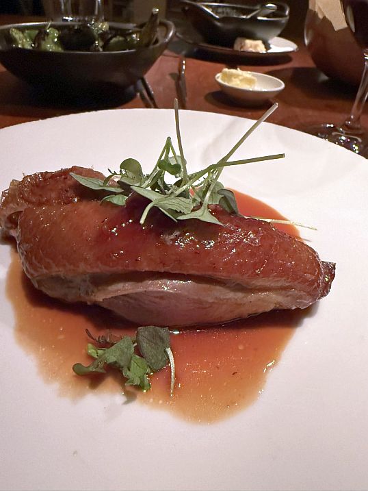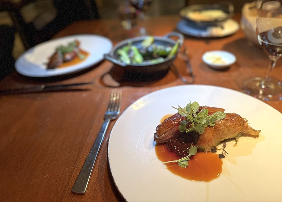 As the name suggests, duck dishes are a specialty and often a highlight. Tonight on the menu is a roasted duck breast and leg confit served with a glossy wine sauce.