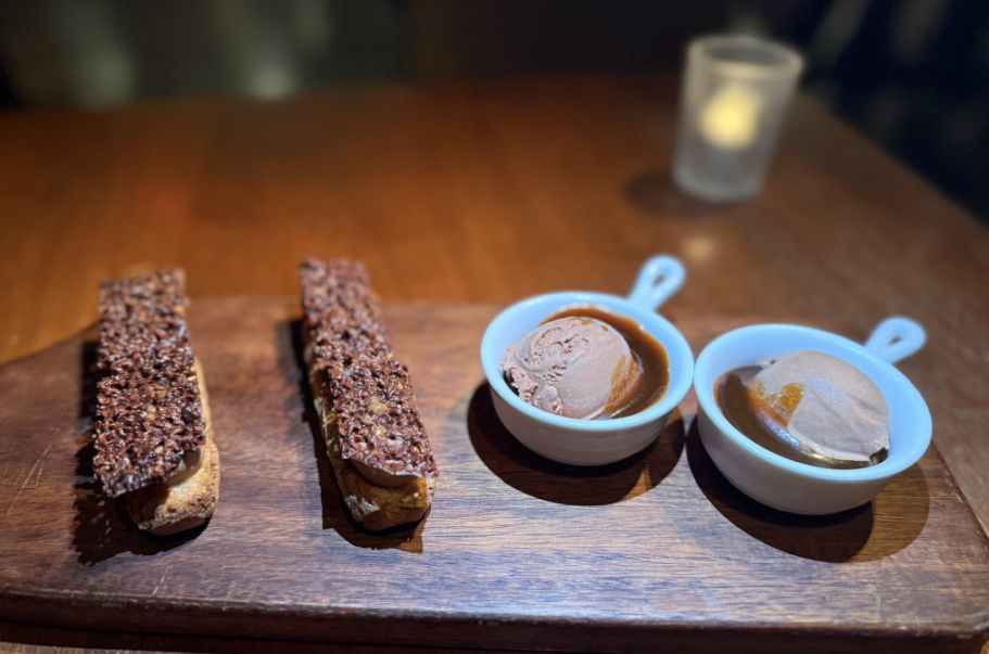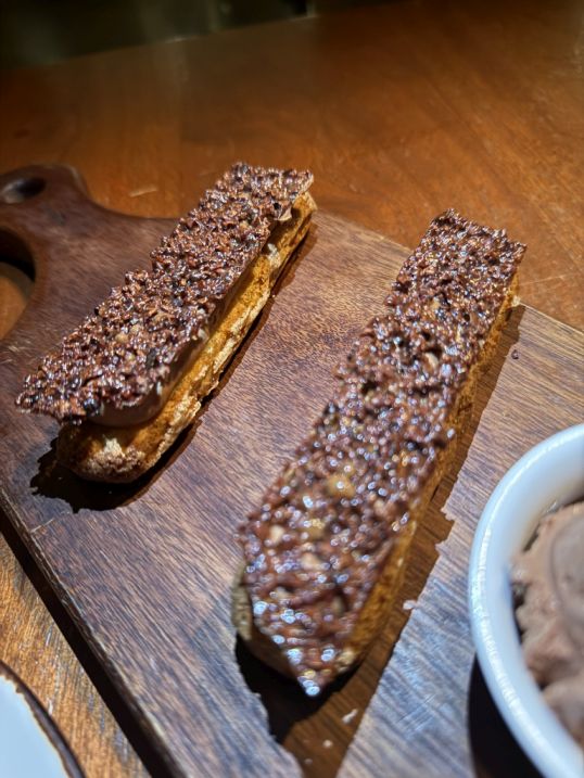 Ending the meal with a platter of Eclairs Praline, Chocolate Ice Cream with Caramel Sauce served on a wooden cutting board.