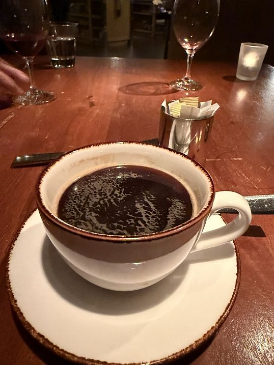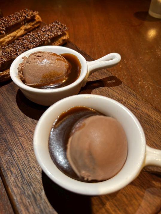 Rich, with and intense taste of chocolate ice cream, smooth and creamy paired with warm caramel sauce brings that perfect bittersweet balance. The caramel’s buttery sweetness softens the intensity of the chocolate, creating a classic and satisfying combination. A simple cup of coffee to close the meal helps reset the palate after the sweetness. The slight bitterness complements the praline and chocolate notes, making the finale feel complete rather than overly rich.