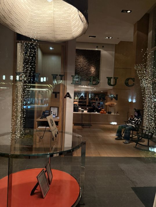 This is the entrance to the Park Hyatt Washington, the lobby is very its elegant, contemporary design with warm wood tones, soft lighting, comfortable seating areas, and a calm, upscale atmosphere. It tends to feel more intimate and welcoming than a large dining space at the Blueduck Tavern.