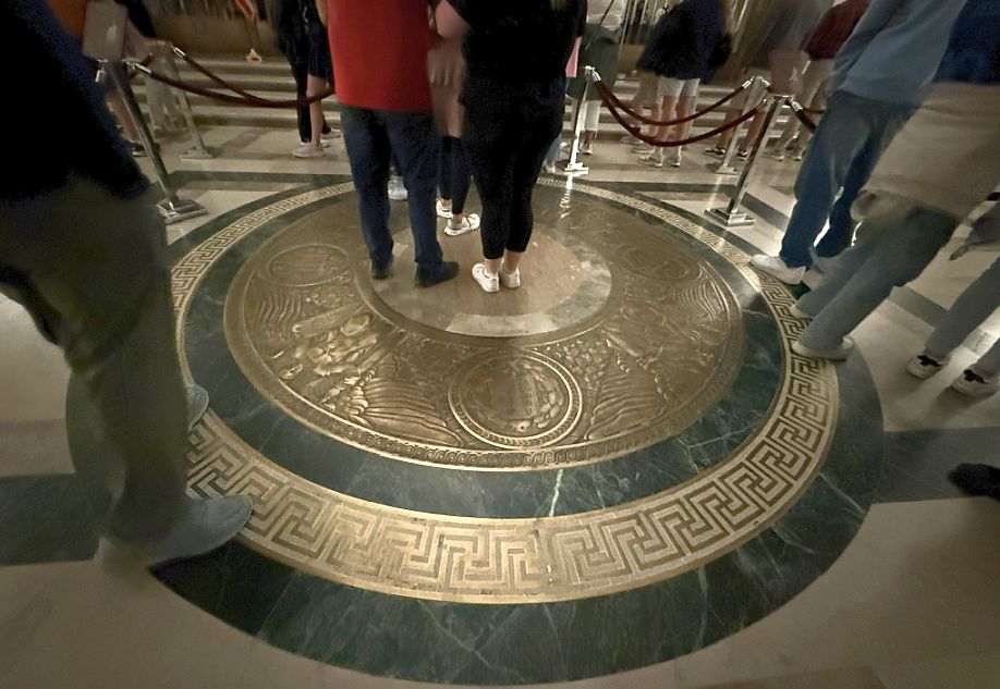 The large golden circle with green marbles on the floor before entering the Rotunda is the Bronze Floor Compass.